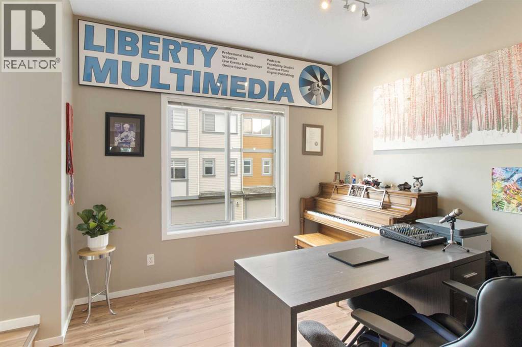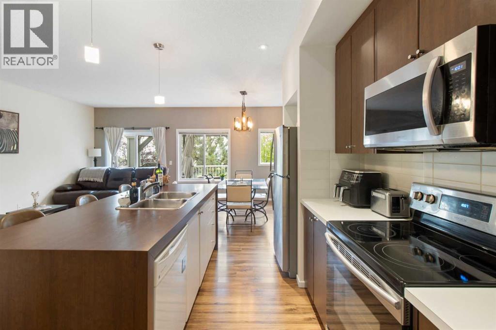 Beautifully styled with modern finishes, this 3 storey townhome offers a bright and functional layout designed for comfort and connection. An insulated and drywalled single attached garage with storage connects to the entry level for everyday convenience. On the main floor, 9’ ceilings set the stage for a bright and open layout. A welcoming living room is styled with a feature wall that adds warmth and character. Patio sliders bring in natural light and open to a south facing balcony with green space views, an ideal backdrop for barbeques or quiet evenings outdoors. The adjacent dining room is anchored by designer lighting and flows easily into the stunning kitchen where 2 toned cabinetry, stainless steel appliances, a pantry and a large island provide both style and utility for casual gatherings or daily routines. A versatile flex space offers endless options for a home office, hobby room, media lounge or gym. Handily a stylish powder room completes this level. Upstairs, a spacious primary retreat includes a walk in closet and a private 4 pc ensuite, while a second large bedroom also enjoys a walk in closet and nearby access to another 4 pc bathroom. Convenient upper level laundry enhances everyday function. Comfort is assured with tankless hot water, in-floor heating and a water softener for efficiency and ease. This quiet complex is surrounded by pathways, parks and green space, with Kenneth D. Taylor School just a short walk away. Nearby Evanston Towne Centre offers shops and restaurants within minutes, while the environmental reserve and winding community pathways encourage a walkable lifestyle in this extremely connected neighbourhood. Offering style, comfort and convenience in equal measure, this home is a perfect fit for today’s modern lifestyle! (id:51913)