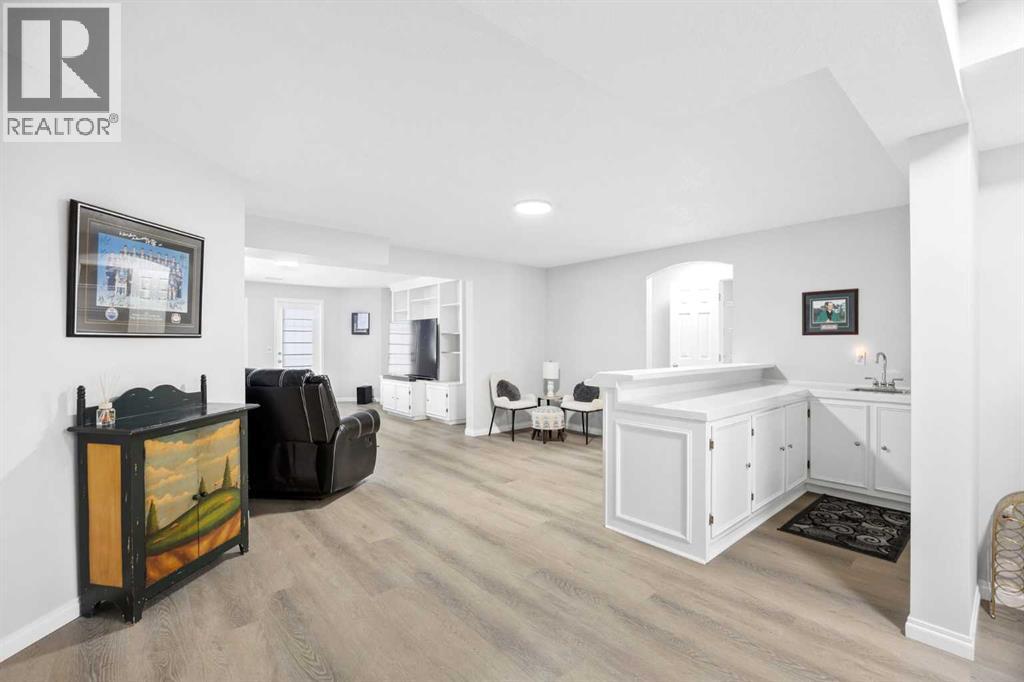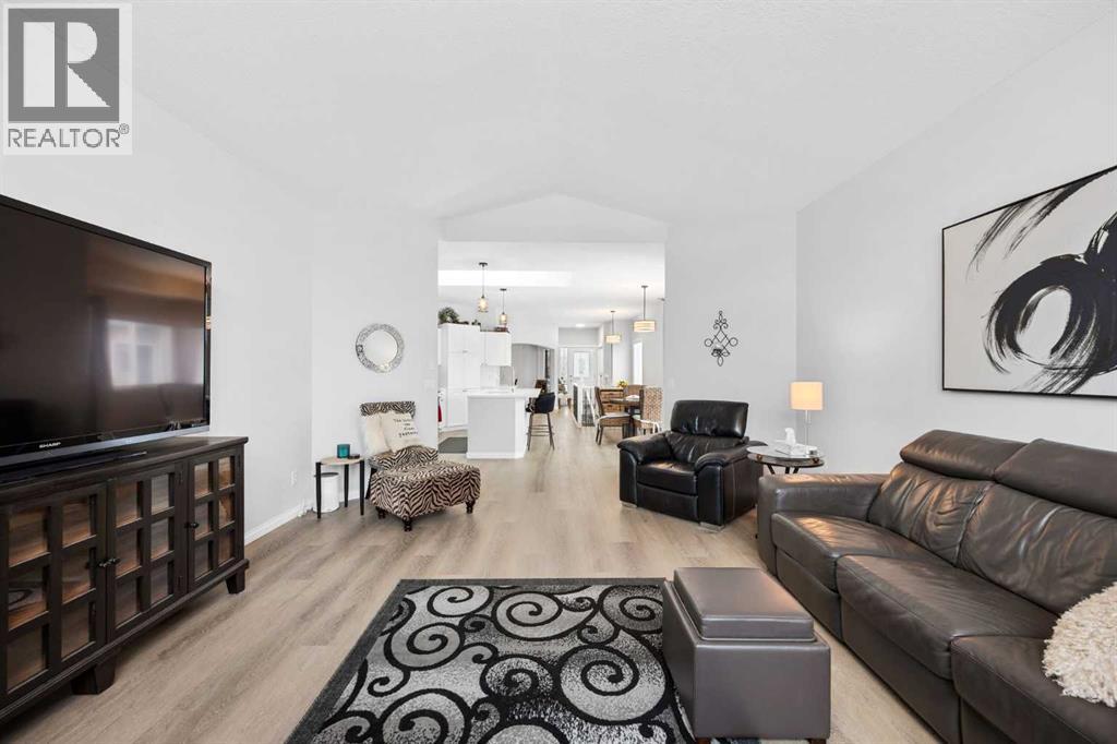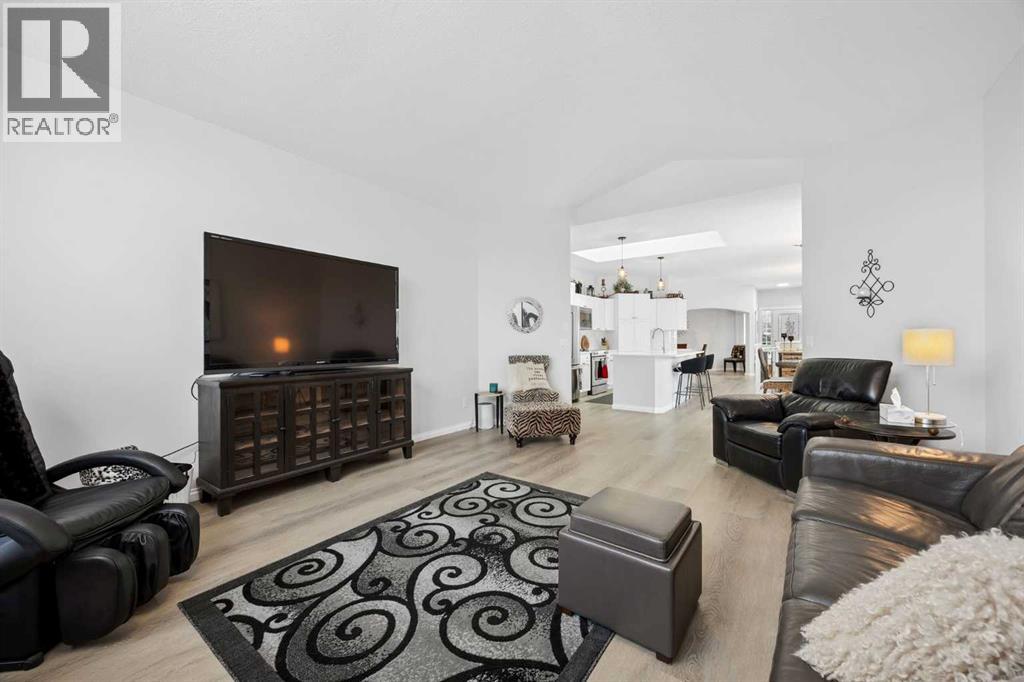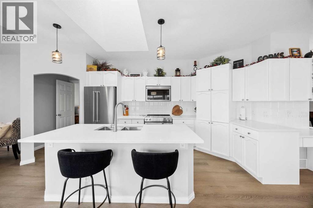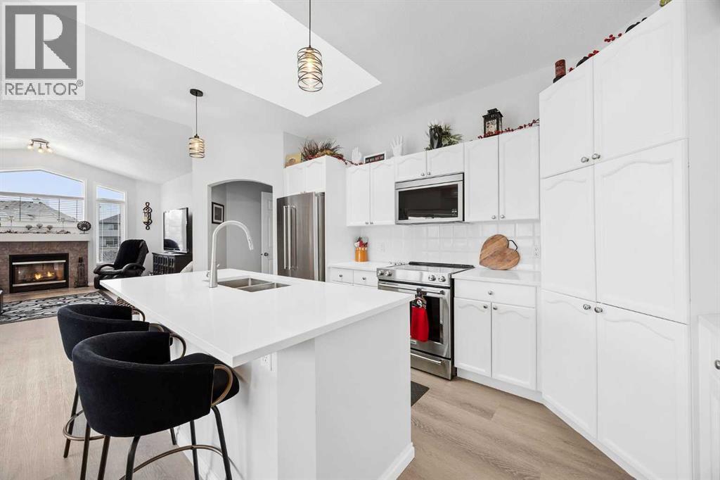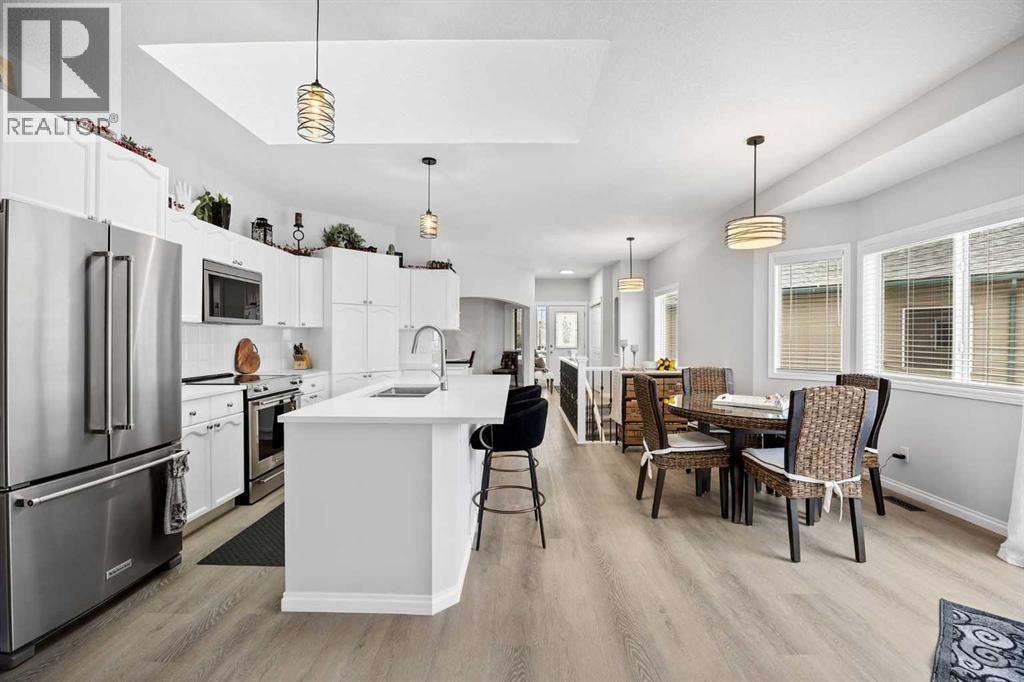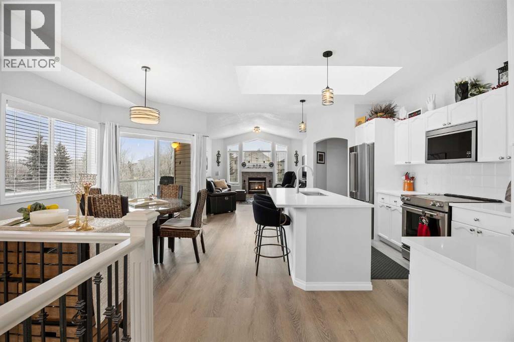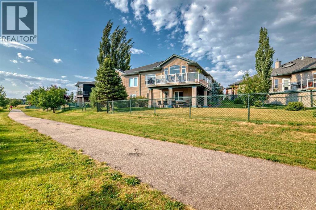 Welcome to this stunning Attached Walkout Bungalow, beautifully designed and professionally renovated 2 bedroom, 2 1/2 bath home. Nestled in a quiet cul-de-sac in the heart of Chestermere with "No Condo or HOA Fees". Boasting over 2300 square feet of sophisticated living on both levels, this air conditioned home has been thoughtfully updated from floor to ceiling. Enjoy all new KitchenAid stainless steel appliances, sleek quartz kitchen countertops, upgraded flooring, new bathroom fixtures, new light fixtures, popcorn ceiling removed, cabinets, railings and walls all painted. The bright open floor concept, includes 9' ceilings, vaulted living room ceiling with a gas fireplace, architectural archways to accent the main level. The spacious kitchen features a large skylight, island with breakfast bar and casual dining area for every day use, with access to an incredible upper west facing outdoor deck. The main floor includes a large formal dining room adjacent to the kitchen ideal for family and friends gatherings. The large primary bedroom includes a spa-like 4 piece ensuite with a jetted tub and walk-in closet. The laundry room (new high end washer/dryer) is conveniently located on the main level complete with a large mudroom with plenty of storage. The elegant grand curved stair case with spindle railings leads you to the beautiful developed basement. The lower walk out boasts a large second bedroom, full bath, large rec room with entertainment built-ins and a bar area, perfect for entertaining! It also includes a storage room that is ideal for any hobbyist or future development. From here step out to your beautiful lower patio into your large pie shaped back yard backing onto a stunning walkway and pond. Avoid those high condo fees, there is an OPTIONAL maintenance fee for $134/month that includes lawncare, shoveling and seasonal irrigation maintenance. Allowing you to enjoy all of the amenities that the City of Chestermere offers, lake activities, golf, shopping, restaurants, recreation. Pride of ownership shown throughout this quality built Shane Home. This beautiful property is a rare find and is located only 20-25 minutes from downtown Calgary, Call to view! (id:51913)