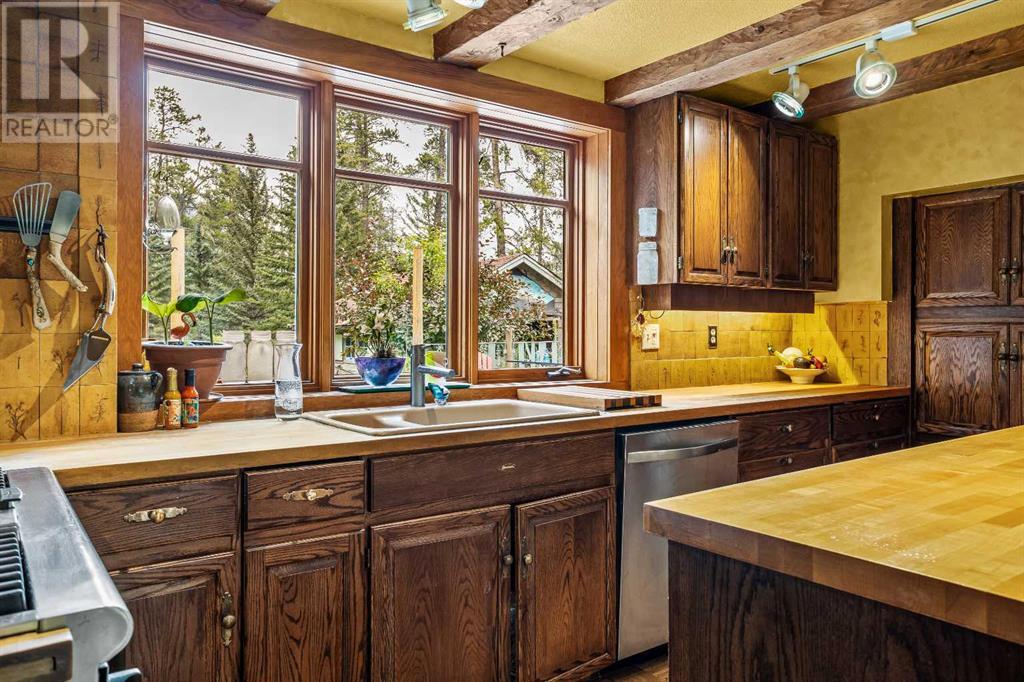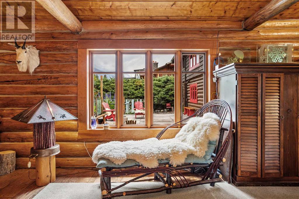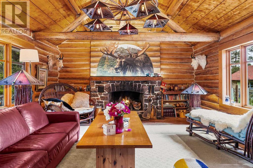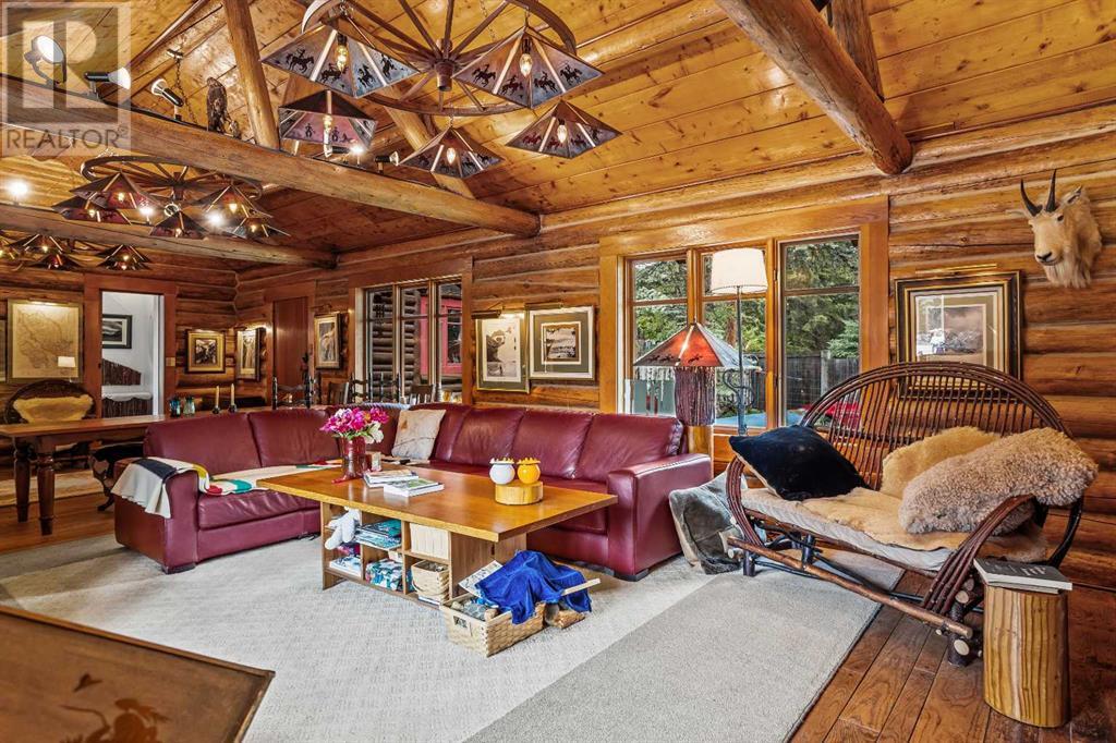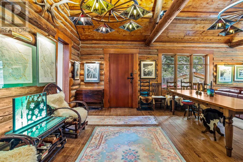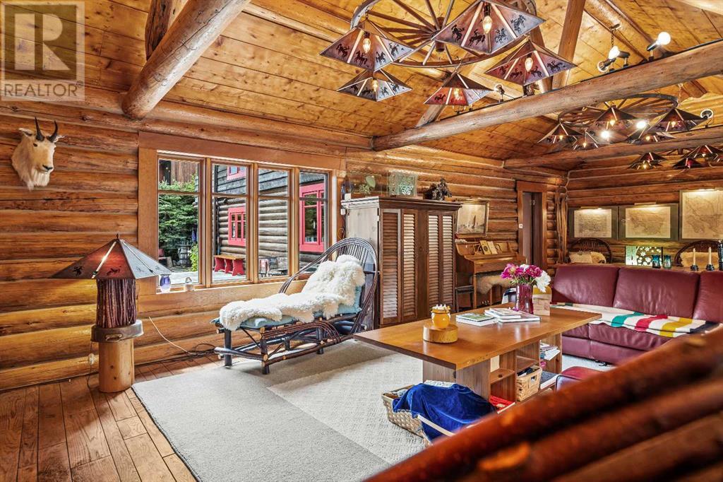Fabulous possibilities in this Banff propertyWelcome to Banff, where this classic residence epitomizes Banff's finest district, Kootenay Ave. This unique modernized log home is secluded in the heart of Banff, where privacy and comfort are the norm. It offers extraordinary mountain views and the unparalleled lifestyle of living in beautiful Banff. The rear exterior boasts a 300-square-foot cedar deck with a hand-carved glass panel depicting local flora and fauna on a dimmer switch. This deck overlooks Mt Rundle, currently a B&B, with the possibility of developing this property into three lots.Layout: Main Level Entry with two wings.Lot: Features a Parklike Setting, Private, over 21,600 sq ft. Heating: Natural gasFlooring: Hardwood, carpet, linoleum. Roof: asphalt with solar panels. Parking: Room for five carsExterior: Feature fencing, Garden, Decks and BarnInterior: Rustic Living Room/ Dining Room & Island Kitchen with a Gas Range, two Island KitchenLaundry: Main floor Fireplace: Description Wood Burning Amazing possibilities and Pride of Ownership. (id:51913)