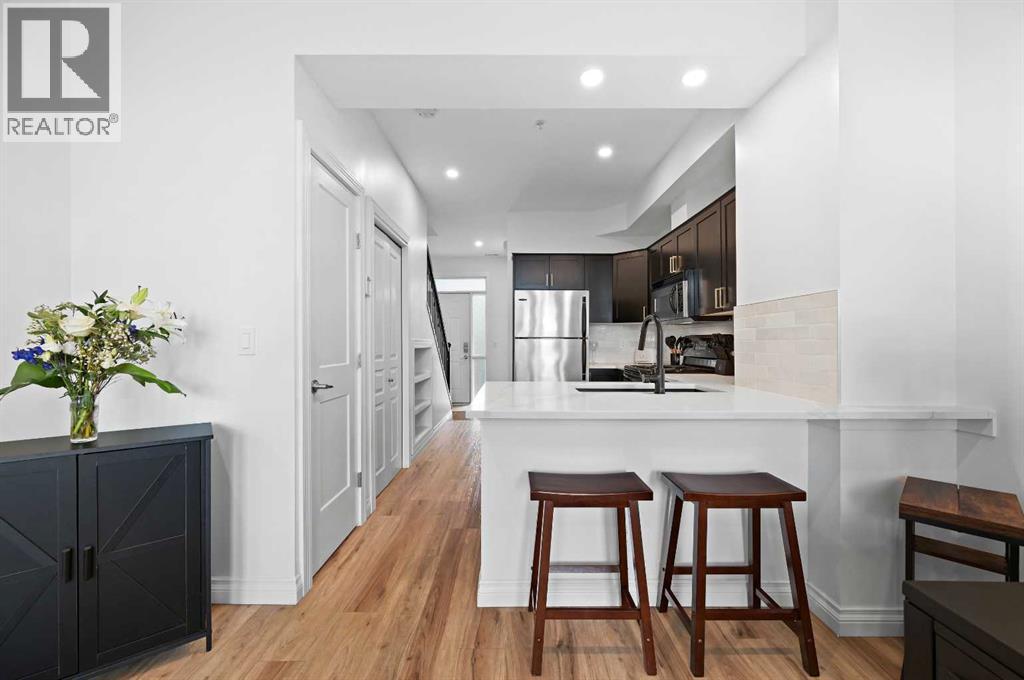 Welcome to your Rocky Ridge retreat, a two-storey condo where thoughtful design meets mountain-view magic. With over $40,000 in upgrades, this isn’t just a renovation - it’s a reinvention of space, light, and style.Step inside and you’ll feel it immediately : airy 9-foot ceilings, endless sunlight from oversized south-facing windows, and a flow that just makes sense. The main floor shines with new wide-plank luxury vinyl, modern lighting, and a completely redesigned kitchen, quartz countertops, Italian tile backsplash, new fixtures, pot lights, and yes… the popcorn ceiling is officially gone.Upstairs, the primary suite is pure calm, offering panoramic greenspace views and a sleek private ensuite. The second bedroom is generous and bright, with double closets and access to an updated 4-piece bath that feels straight out of a boutique hotel.Practical perks? Two titled underground parking stalls, a titled storage locker, and access to a fully equipped fitness centre all within a well-managed complex surrounded by parks, transit, and the best of Rocky Ridge.Whether you’re a first-time buyer, downsizer, or investor, this home checks every box: stylish, move-in ready, and filled with natural light.Elevated living starts here. Book your showing today, your next chapter in Rocky Ridge is waiting. (id:51913)