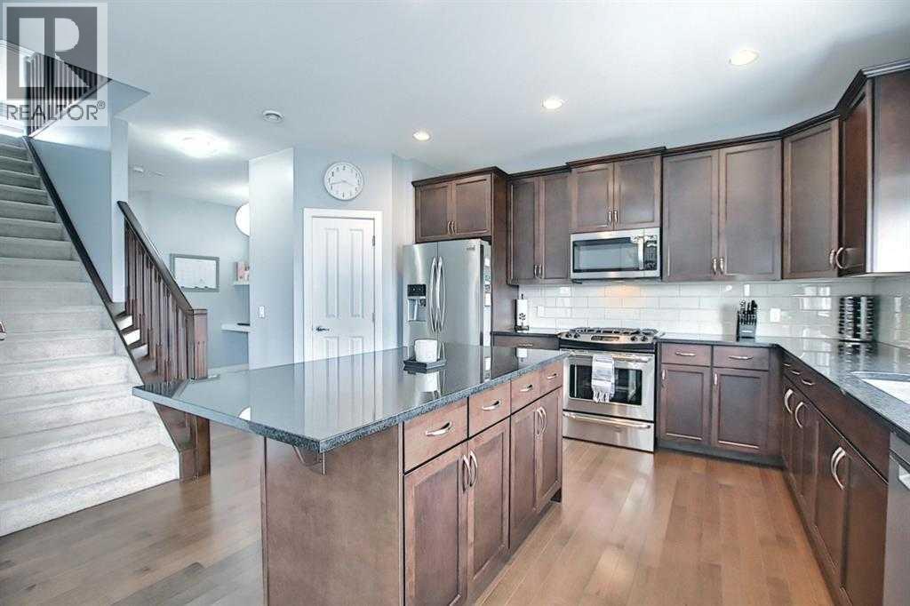 Nestled in the Heart of Walden is this absolutely lovely detached home located on a very quiet street, within close proximity to playgrounds, schools, shopping, restaurants, and multiple pathways leading to ponds and creeks. This home features high ceilings and beautiful hardwood floors throughout the main level, along with a convenient front office ideal for working from home. The large kitchen includes a center island with granite countertops, stainless steel appliances, corner pantry, tall cabinets, and ample counter space. The main floor family room is complete with a cozy gas-burning fireplace, dining area perfect for gatherings, and direct access to the back deck through oversized glass doors that bring in plenty of natural light. Upstairs, you’ll find a spacious bonus room, upper-floor laundry, and three generous bedrooms. The primary suite features a full ensuite with granite countertops, soaker tub, tile flooring, and walk-in closet. The basement offers a smart layout with rough-ins already in place, ready for your finishing touches. The attached double garage is spacious and includes a built-in sink with cabinets, making it practical for cleaning tools and hands before re-entering the home. Numerous upgrades are found throughout, including granite counters in every washroom, built-in features, plenty of windows, stylish light fixtures, and more. The exterior showcases mature trees, a fully fenced backyard, and welcoming curb appeal. This home has been freshly painted throughout and has brand new carpets, offering a move-in ready feel. Please note: photos are from a previous listing. “Home will be professionally cleaned prior to possession – seller is open to negotiating an offer.” (id:51913)