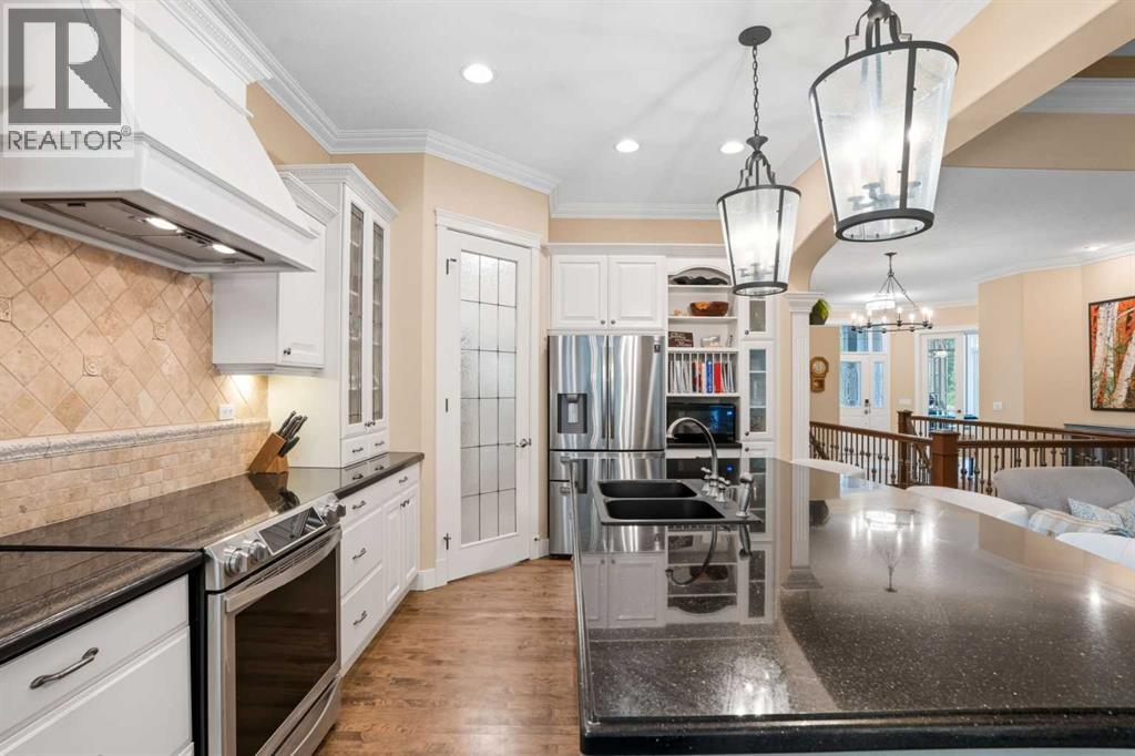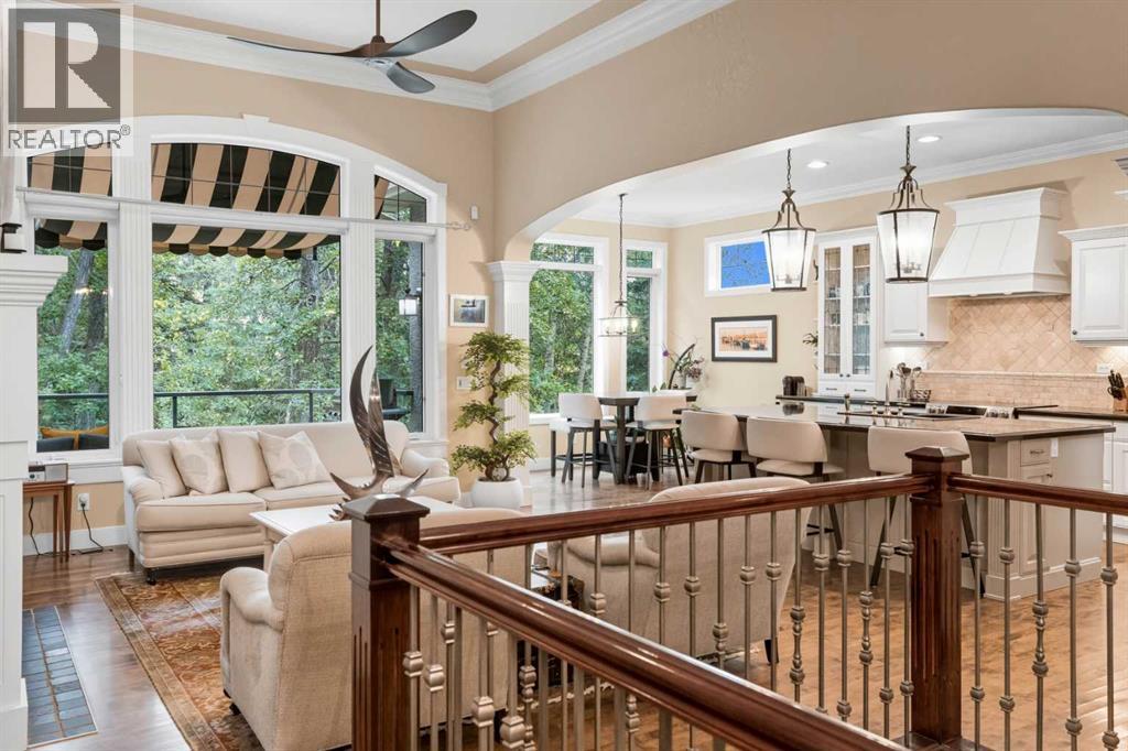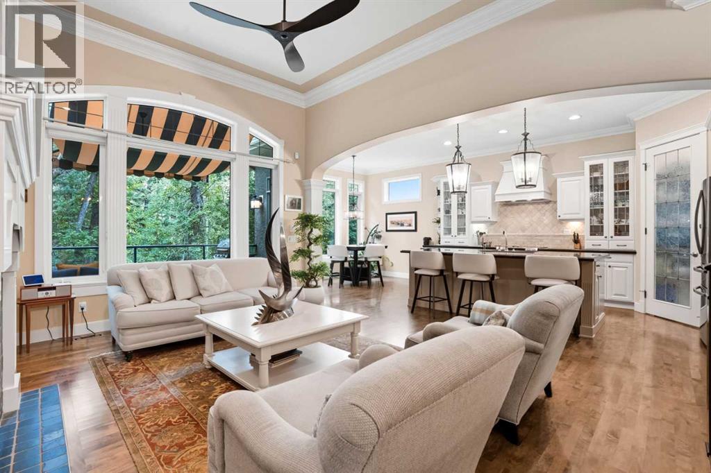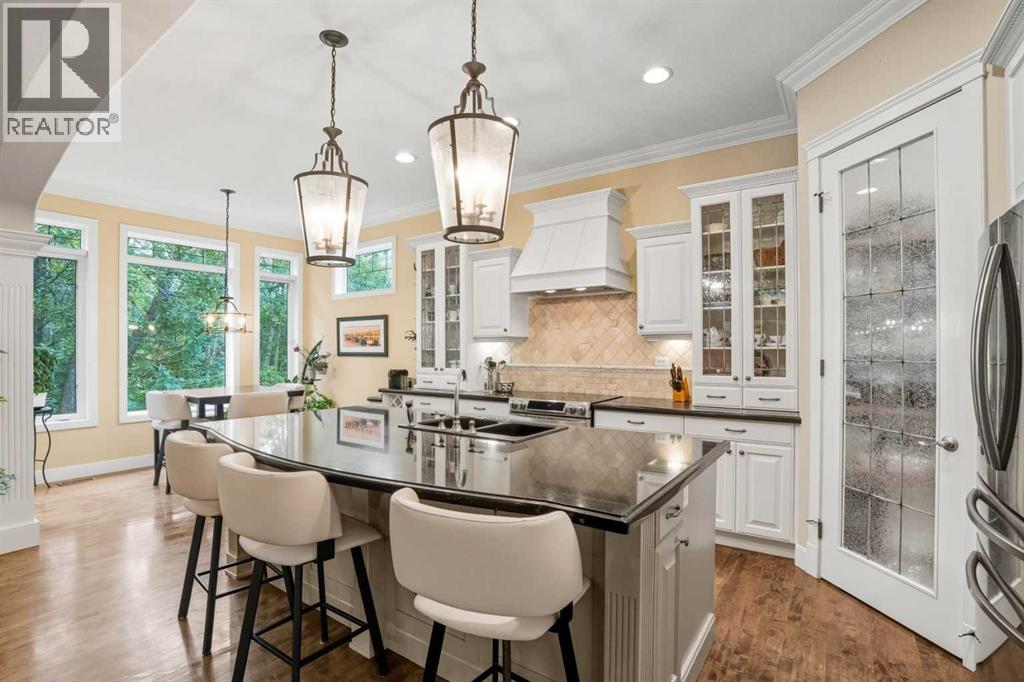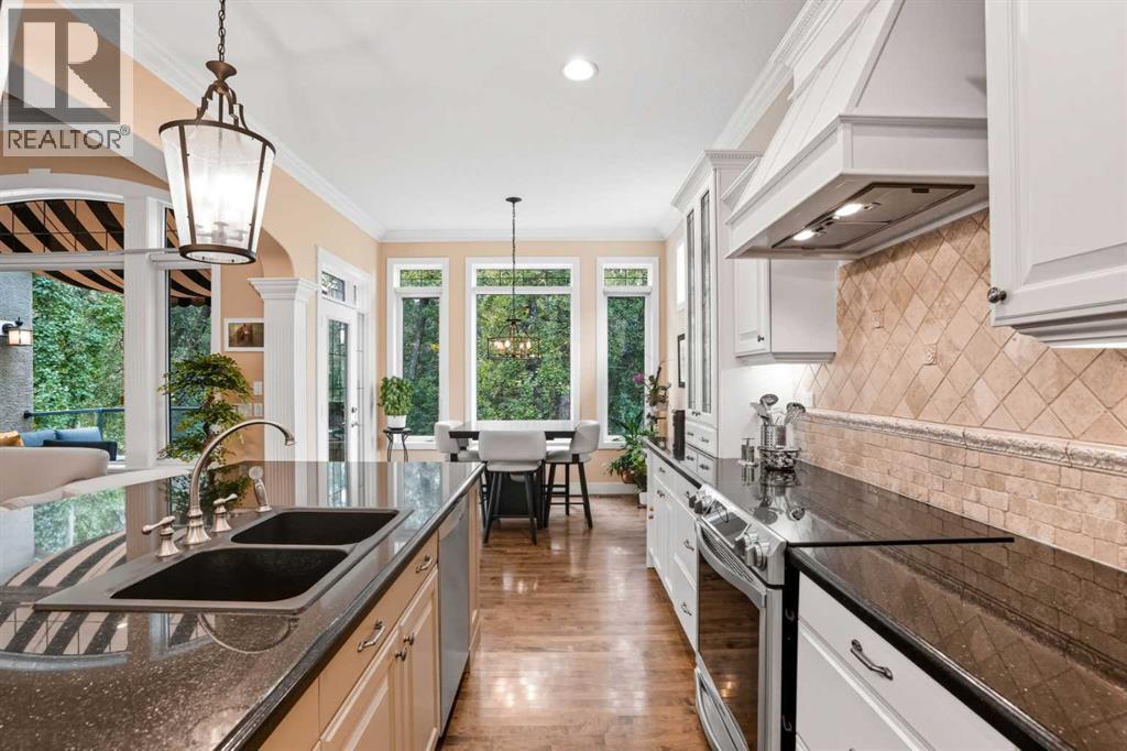 **Open House on Saturday, September 20, from 1-3 pm** Banff in the city… this is how life feels in Discovery Ridge. Tucked along the quiet beauty of Griffith Woods, this exquisite walkout bungalow is a rare find—timeless in its elegance, yet carefully updated with thoughtful, modern touches.From the moment you step inside, the home greets you with soaring ceilings, rich millwork, and warm hardwood that together create a sense of refined luxury. The living room, anchored by a beautiful fireplace, looks out through expansive windows to the forest beyond—a daily reminder that here, peace and privacy are yours. The gourmet kitchen is as inviting as it is functional, with a large island, granite counters, and a bright breakfast nook that catches the morning sun. Just beyond, a formal dining space welcomes gatherings, while a charming main floor office framed by bay windows offers an inspiring place to work. The primary suite completes the main level, its serene outlook onto the trees paired with a luxurious ensuite and custom walk-in closet, making it the perfect retreat.Downstairs, the walkout level extends the living experience with 9’ ceilings, cozy in-floor heat, and a sense of comfort that invites you to linger. A spacious family room flows naturally into a private theatre, with a massive entertainment space. For family or guests, a full second kitchen—complete with oven, dishwasher, refrigerator—offers self-contained convenience. Two generous bedrooms and a large exercise bonus room ensure plenty of space for everyone.This home is as practical as it is beautiful. A new high-grade Vacuflo system has just been added and the garage includes a custom platform for an extra fridge or freezer. Outside, the home is elevated by Gemstone lighting that sparkles year-round, casting a warm glow over evenings spent on the private deck or lower patio. The backyard feels like a retreat, with mature trees creating a natural screen. Through a discreet gate, your own private tr ail connects you directly to the endless pathways of Griffith Woods—a haven for biking, walking, and quiet reflection.Discovery Ridge is one of Calgary’s most treasured communities: secluded, peaceful, and embraced by nature, yet only minutes to the city’s best amenities. This is more than a home—it is a sanctuary, a gathering place, and a lifestyle, all in one. (id:51913)