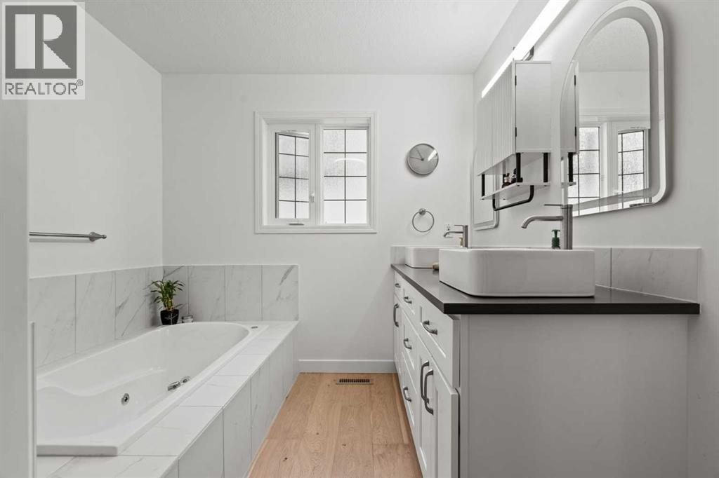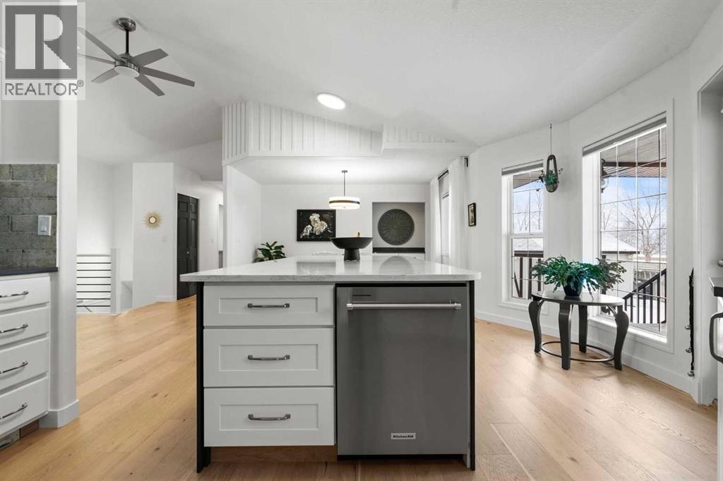 This MOVE IN READY HOME has been thoughtfully updated with features that focus on function in designing this ELEGANT MAKEOVER. A freshly painted front exterior and cozy covered front verandah speak to the classic curb appeal that sets this home apart in a league of it's own. Vaulted ceilings soaring above banks of windows that capture the natural light highlight the open floor plan that flows seamlessly... inviting larger family gatherings or intimate get togethers. A neutral paint palette offsets the gorgeous new engineered hardwood flooring - trimmed with high profile baseboards on the main floor. Masterfully crafted is the focal point of the main floor - a stunning island addition that isn't just an amazing storage and dining area.. it's the hub of this gorgeous family home. Custom designed wood details trim the island and complement the feature walls located in several areas of the house. A massive quartz slab accentuates the grandness of the island and showcases the sleek quartz topped cabinetry at the rear of the kitchen. A refreshed stone tiled backsplash complements the Stainless Steel appliances. Banks of drawers have been added for convenient storage. A spacious Living Room with a re-faced gas fireplace is offset from the kitchen for entertaining. An open-ended dining area boasts enough room for a larger table and a servery/coffee bar has been added for your convenience. The primary suite tucked away at the end of the hall delivers privacy and solitude and features custom wall detailing, a walk in closet and a lovely updated 5 pc ensuite bath complete with a jetted soaker tub and separate shower. Main floor laundry and a 4 pc main bath complete the main level. The bathrooms showcase new quartz topped vanities, tile backsplash and new sinks and taps. Ascending to the loft you are greeted by a spacious room that can be anything you need. Vaulted ceilings, lots of windows and sky lights to brighten the room all day, easy care engineered hardwood flooring... easy to add an area rug for a TV get away/bedroom or perfect as is for a crafters room. The four piece main bath is at the bottom of the stairs to accommodate a bedroom in the loft area. The lower level has a 4 pc bath, two additional bedrooms and plenty of room to add more with legal egress windows and 9 ft ceilings already in place. In floor heat keeps this level cozy in the winter months and the AC keeps the rest of the house cool in the summertime. A massive open recreation area in the lower level will fit your pool table and gaming desires to create a family sized entertainment area. The oversized 24'11"x 24'11" insulated and drywalled garage has in floor heat, and a 220 V power source. In ground sprinklers, a man sized garden shed with power, perennial beds laid with rocks that flank the perimeter and front grounds, and covered front and rear porches to satisfy your outdoor enjoyment complement the mature landscaping. This home is a dream to show! Call today! (id:51913)