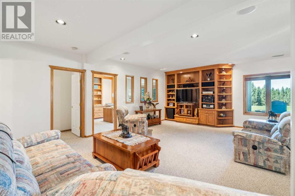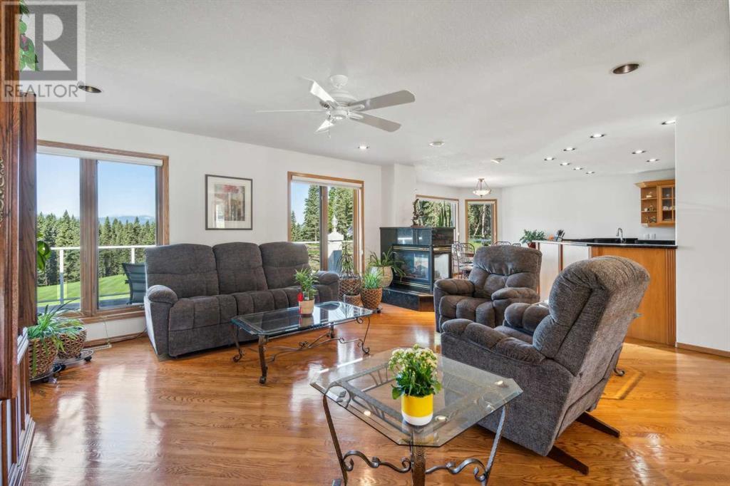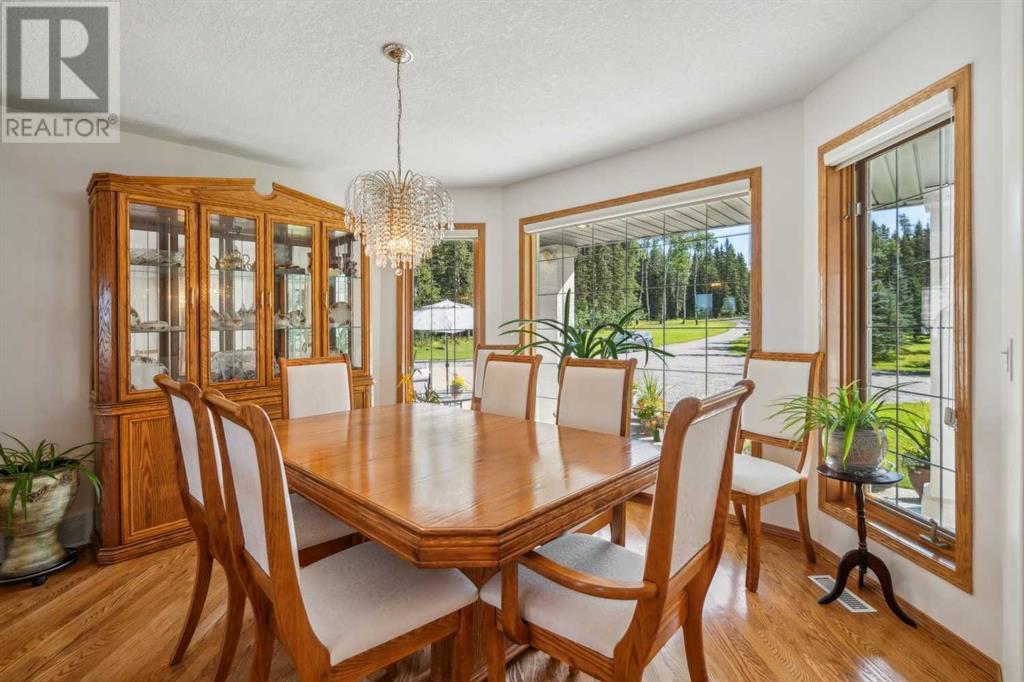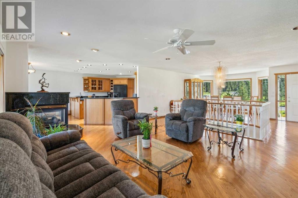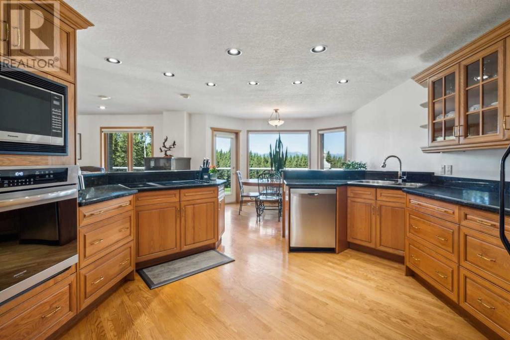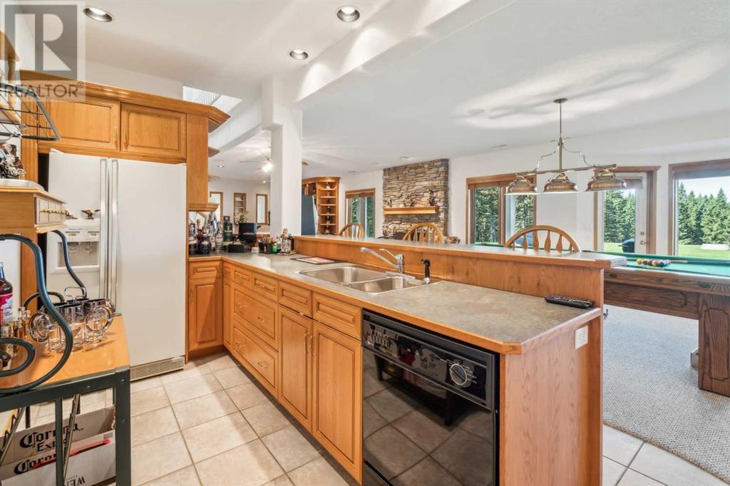 ** GORGEOUS VIEWS, GREAT SAUSAGE**Less than thirty minutes from Calgary lies a jewel of a home, a secluded acreage with stunning views, and some very unique outbuildings. This 23 acre estate has a main floor and lower-level walkout; both with sweeping vistas of the impressively landscaped backyard and mountains beyond. Upon arrival through the private cul-de-sac, the first thing you notice are the impeccably maintained lawns and groomed driveway. The front entrance opens to a bright foyer that leads either to a formal dining area, or to a grand living room with site-finished oak floors and many windows showcasing the beauty beyond. It shares a three-way gas fireplace with the cosy dining nook and bay window, and the updated kitchen with quartz countertops and a large walk-through pantry. The pantry connects to the generous garage mudroom and laundry room. The large back deck runs along the length of the house and opens into the primary bedroom suite with walk-in closet, bay window, and 4-piece en-suite. This wing of the house has two more good size bedrooms and another full bathroom. The heated three-car garage is an appealing feature with almost 1400 square feet of room, plenty of storage, windows, and a separate stair leading to the lower level. Downstairs you’ll find a large rec room with updated Berber carpet and a fieldstone floor-to-ceiling wood-burning fireplace, as well as an amazing bar with its own full size fridge and dishwasher- the perfect place to entertain. There is also a spacious office, and another bedroom and bath that would be perfect for guests. Leaving the main house, you’ll come to a truly special feature of the property, a large shop which is a mechanics dream. Not only does it have a ten thousand pound hoist and lift, but also radiant in-floor heat, and has its own bathroom, shower and laundry. Socks not completely knocked off? Attached is a fully functional butcher shop where the owners are producing “the best sausage you’ve ever had”. How many other properties can say that? Although this space would be a hunter's delight it also has many possibilities for other hobbies or home based business, with its gleaming tile, industrial sinks and walk-in cooler. There is also another 30 x 60 storage building for the toys; to store boats, cars, recreational vehicles or any other equipment. This acreage is one of a kind! (id:51913)