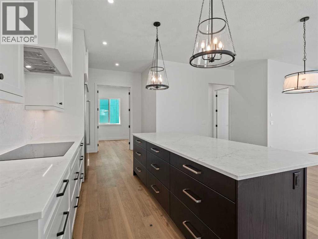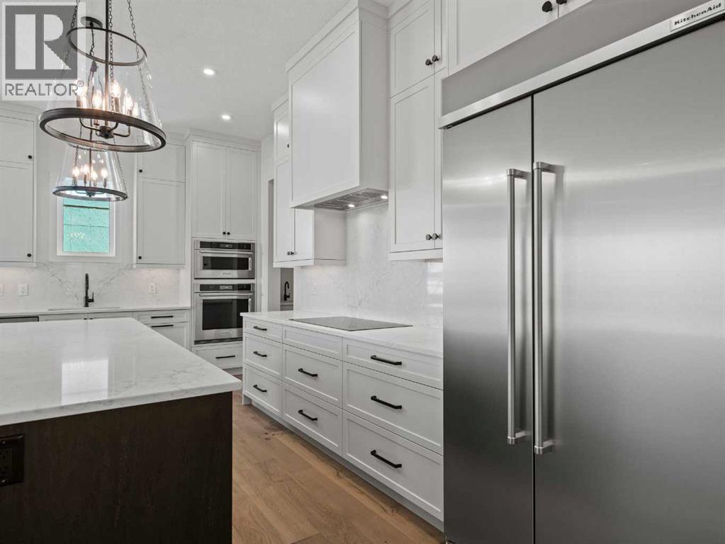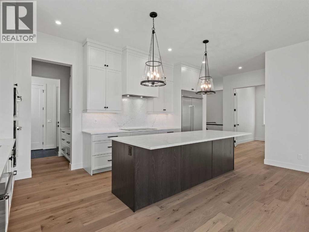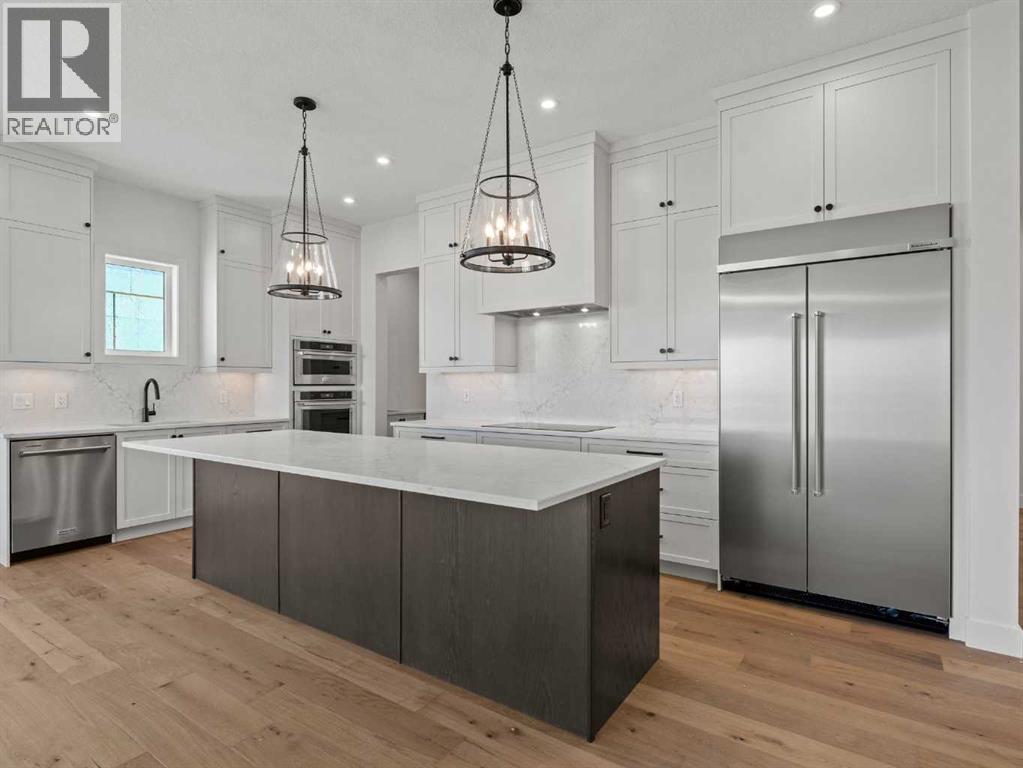OPEN HOUSES THIS WEEKEND...... SATURDAY, OCTOBER 18TH FROM 2:00 - 4:00 PM........SUNDAY, OCTOBER 19TH FROM 1:00-4:00 PM..... SEE YOU THERE.........Nestled in the heart of Calgary's prestigious Mahogany Estates, this brand-new custom-built, 3,200 sq ft bungalow by Baywest Homes redefines lakeside living. With exclusive access to a semi-private dock and beach, this home offers an unparalleled lifestyle in one of the city's most sought-after lake communities. The main level, spanning nearly 1,700 square feet, boasts soaring nine-foot ceilings and wide plank luxury hardwood flooring in natural wood tones, creating a warm and inviting ambiance. The open-concept design seamlessly integrates the living, dining, and kitchen areas, making it perfect for both entertaining and everyday living. The kitchen is a chef's dream, featuring full-height white cabinetry, a striking oversized dark island, and a high-end appliance package that includes a high-end Kitchen Aid fridge-freezer and built-in oven with a convention microwave. Quartz countertops extend as a sleek backsplash, complemented by designer lighting and a butler’s pantry equipped with a bar sink and beverage fridge. The living room, with its elegant feature fireplace, opens onto a north-facing deck overlooking serene green space, complete with a gas line for effortless outdoor grilling. The master suite is a private retreat, offering a spa-like en-suite with heated tile floors, an oversized shower, a freestanding soaker tub, dual vanities, and a private water closet. A spacious walk-in closet and adjacent laundry room add to the convenience and luxury of this space. The main floor also includes a private office with glass French doors, a well-appointed mudroom, and a walk-in closet. Descending to the fully finished basement, you'll find a large recreation room, a family room, two generously sized bedrooms, and a full bathroom with heated floors. The home is thoughtfully designed with ample storage and numerous upgra des, including tankless hot water and triple-paned windows. The attached triple garage, with its 14-foot ceilings, offers ample space for a car lift and is equipped with 220V for a vehicle charging station. This property is a masterpiece of design and functionality, offering the perfect blend of luxury, comfort, and convenience. With its prime location and exclusive amenities, lakeside living in Mahogany has never been more enticing. (id:51913)