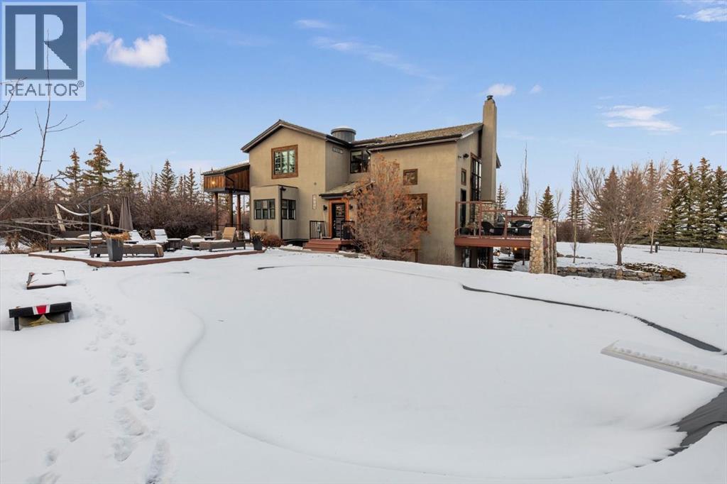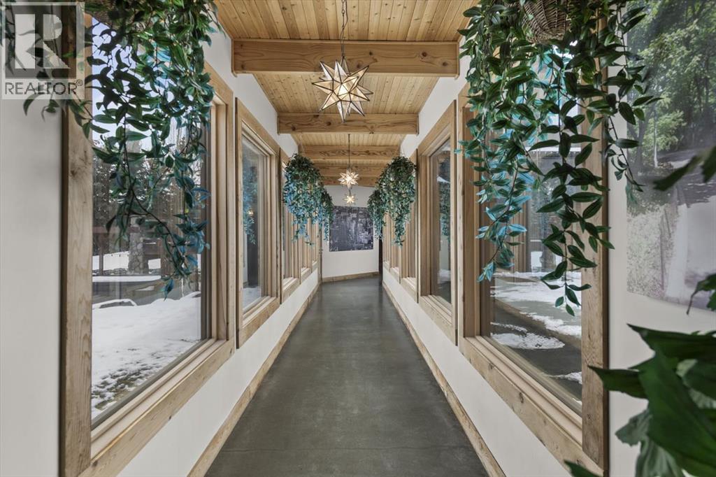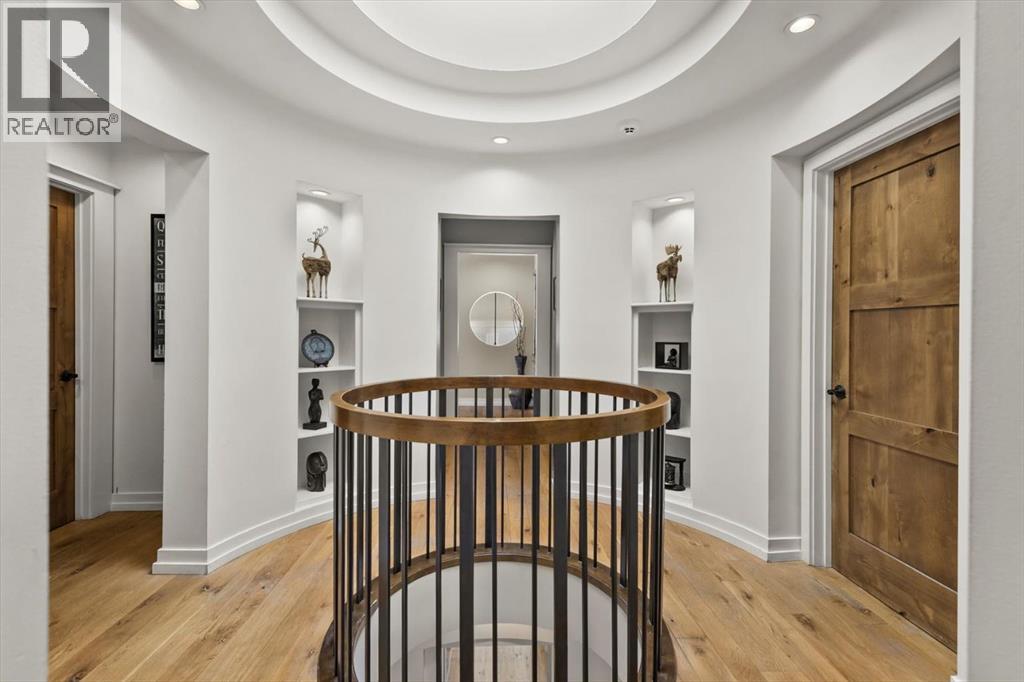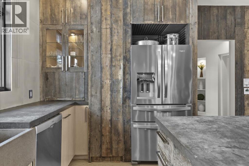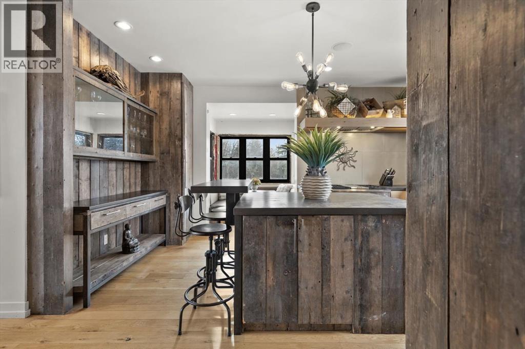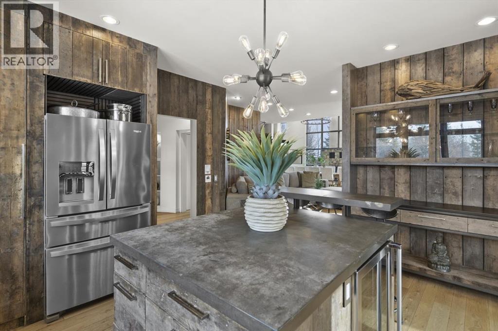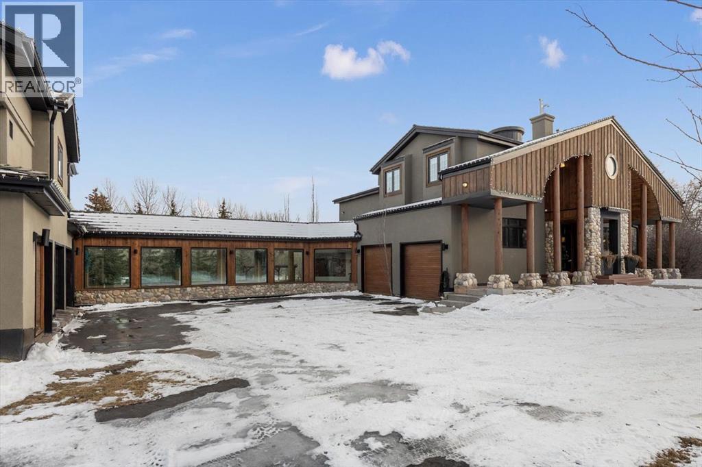 Some homes are designed for function, others for style - this one was designed for something more. Set on just over two acres in Bearspaw, this residence reveals its character the moment you arrive: sweeping curves in the architecture, river rock columns, and a presence that promises there's a story around every corner.Step inside and a circular skylight draws your eye upward, casting light through a graceful rotunda that anchors the home. Those architectural curves continue throughout - in hallways, railings, and built-in niches designed for art and treasured pieces.The main level presents two interconnected living spaces with remarkable flexibility. The larger room, currently configured as an expansive dining area easily seating 14, features soaring ceilings, a river rock fireplace, and walls of windows. The adjacent sitting area offers a more intimate scale. These spaces can easily trade purposes - a generous living room with traditional dining to the side, or kept as designed for those who entertain on a grand scale.Throughout the home, reclaimed barn-board sourced from England creates warmth against contemporary elements - concrete countertops, sleek fixtures, clean architectural lines. It's a considered contrast that feels both grounded and refined. The kitchen embodies this aesthetic, aged wood cabinetry meeting industrial concrete surfaces, a breakfast nook tucked into the window.The primary suite offers a spa-inspired ensuite with pebble stone walls, open shower, and deep soaker tub. Two additional bedrooms, family bathroom and laundry facilities share the upper level, accessed from curved hallways with a striking circular opening overlooking the rotunda.The walkout level opens to casual gathering space, a fourth bedroom, bathroom, exercise area and a very unique dual wine cellar and cigar humidor. A glass breezeway connects the main house to a secondary garage with self-contained guest suite above - Murphy beds and lounge space equally suited a s creative studio or home office. For the collector: a separate garage bay accessed by fingerprint recognition, purpose-built for a prized vehicle.Outside, the property unfolds with equal intention. In-ground pool, hot tub, and firepit create spaces for every season. Circling a stone platform at the heart of the grounds, a moat crossed by two wooden bridges - a meditative feature that speaks to the thoughtfulness woven throughout.For the right person, this won't simply be a beautiful property. It will feel like home. (id:51913)