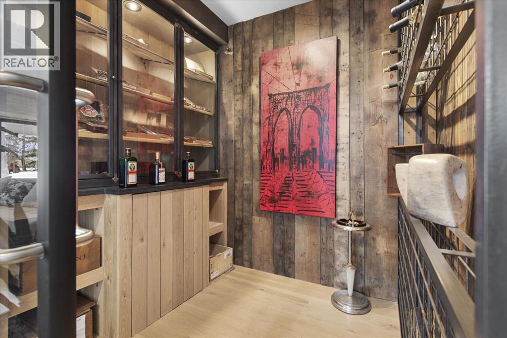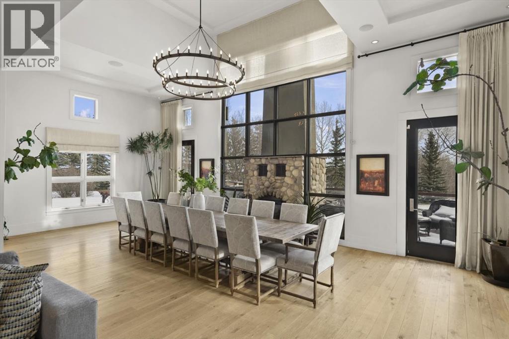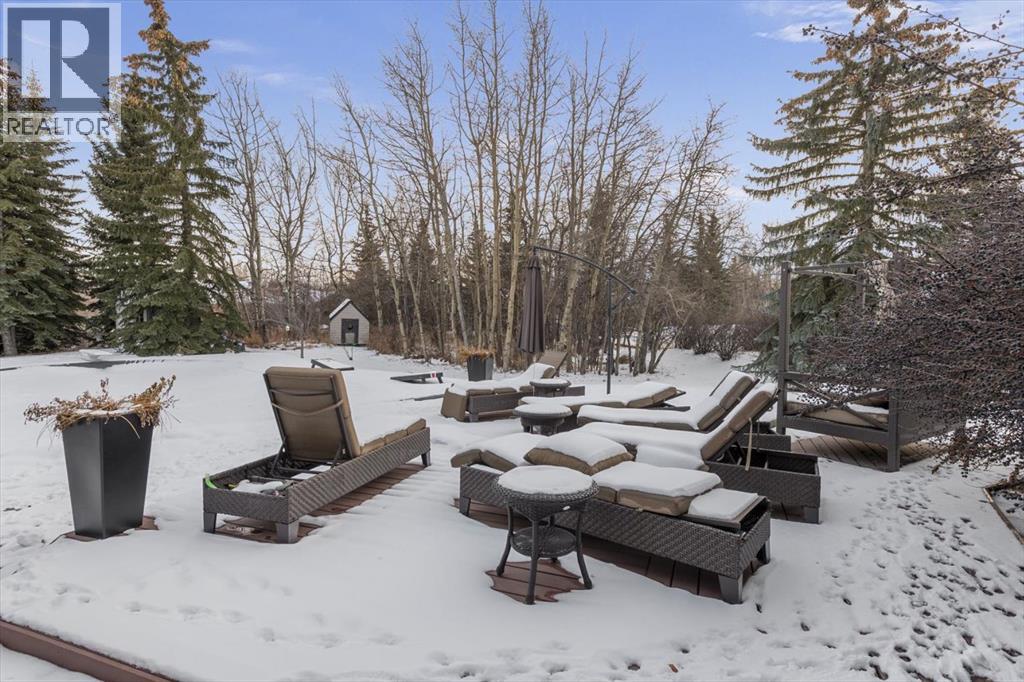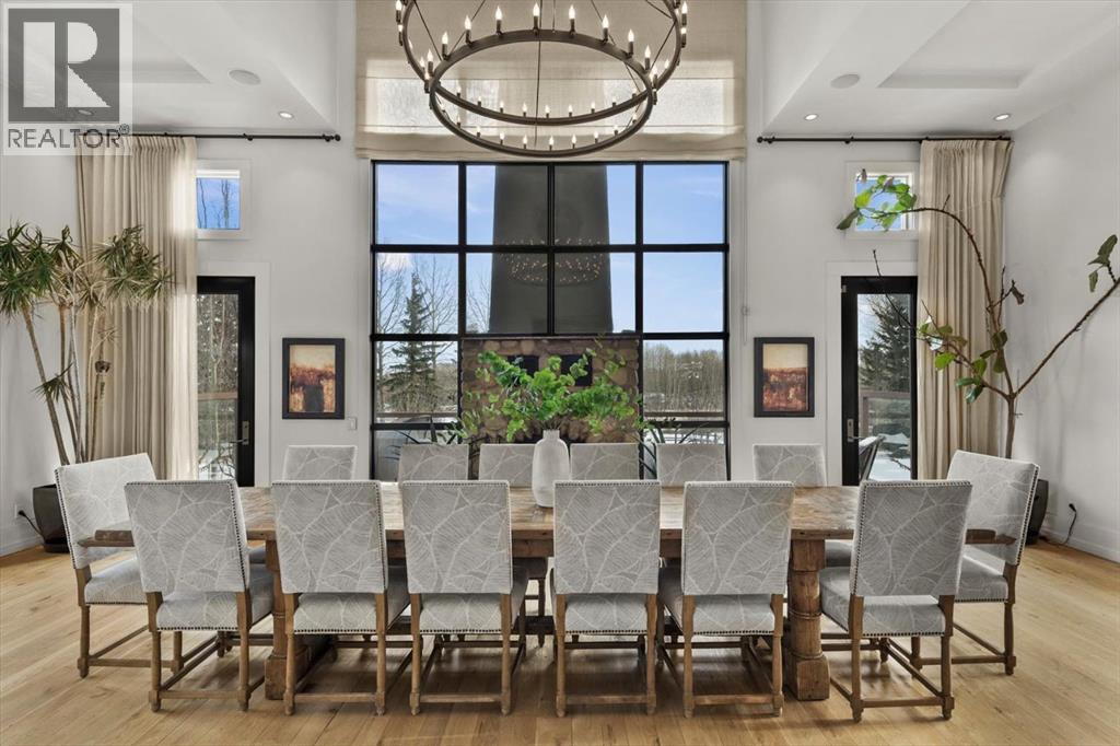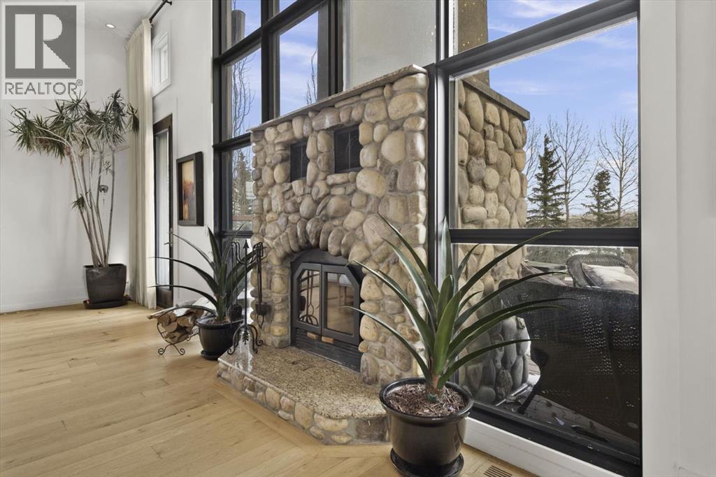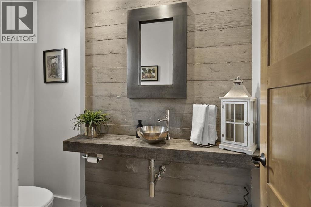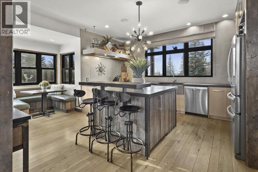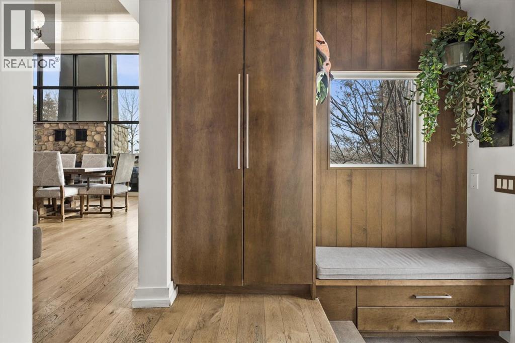 Some homes are designed for function, others for style - this one was designed for something more. Set on just over two acres in Bearspaw, this residence reveals its character the moment you arrive: sweeping curves in the architecture, river rock columns, and a presence that promises there's a story around every corner.Step inside and a circular skylight draws your eye upward, casting light through a graceful rotunda that anchors the home. Those architectural curves continue throughout - in hallways, railings, and built-in niches designed for art and treasured pieces.The main level presents two interconnected living spaces with remarkable flexibility. The larger room, currently configured as an expansive dining area easily seating 14, features soaring ceilings, a river rock fireplace, and walls of windows. The adjacent sitting area offers a more intimate scale. These spaces can easily trade purposes - a generous living room with traditional dining to the side, or kept as designed for those who entertain on a grand scale.Throughout the home, reclaimed barn-board sourced from England creates warmth against contemporary elements - concrete countertops, sleek fixtures, clean architectural lines. It's a considered contrast that feels both grounded and refined. The kitchen embodies this aesthetic, aged wood cabinetry meeting industrial concrete surfaces, a breakfast nook tucked into the window.The primary suite offers a spa-inspired ensuite with pebble stone walls, open shower, and deep soaker tub. Two additional bedrooms, family bathroom and laundry facilities share the upper level, accessed from curved hallways with a striking circular opening overlooking the rotunda.The walkout level opens to casual gathering space, a fourth bedroom, bathroom, exercise area and a very unique dual wine cellar and cigar humidor. A glass breezeway connects the main house to a secondary garage with self-contained guest suite above - Murphy beds and lounge space equally suited a s creative studio or home office. For the collector: a separate garage bay accessed by fingerprint recognition, purpose-built for a prized vehicle.Outside, the property unfolds with equal intention. In-ground pool, hot tub, and firepit create spaces for every season. Circling a stone platform at the heart of the grounds, a moat crossed by two wooden bridges - a meditative feature that speaks to the thoughtfulness woven throughout.For the right person, this won't simply be a beautiful property. It will feel like home. (id:51913)