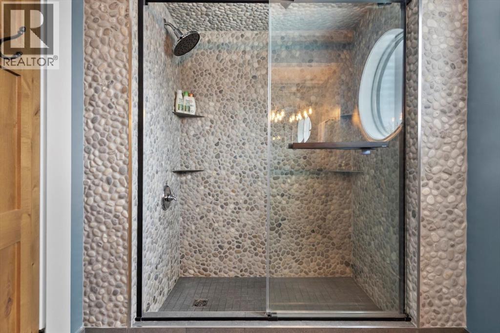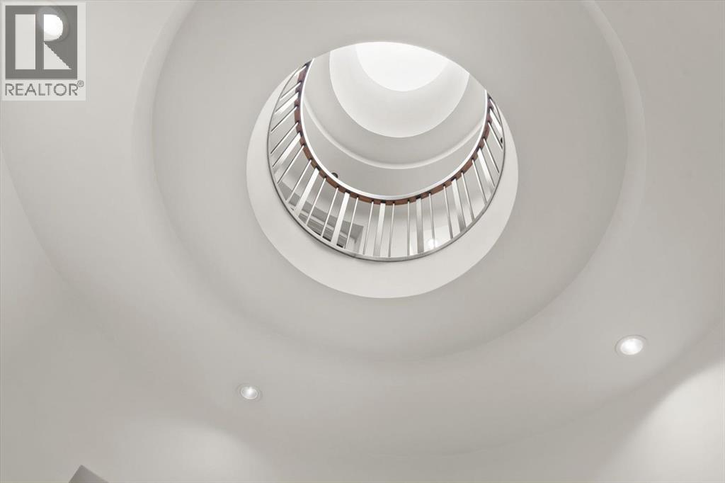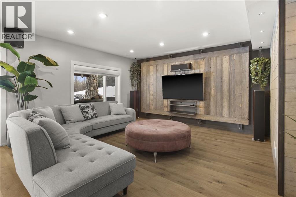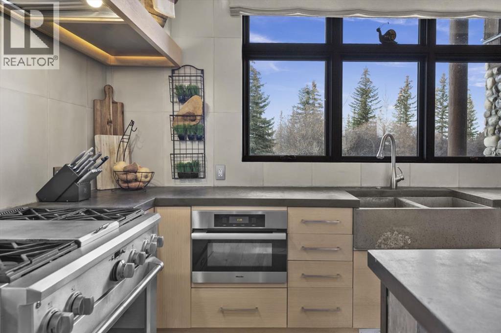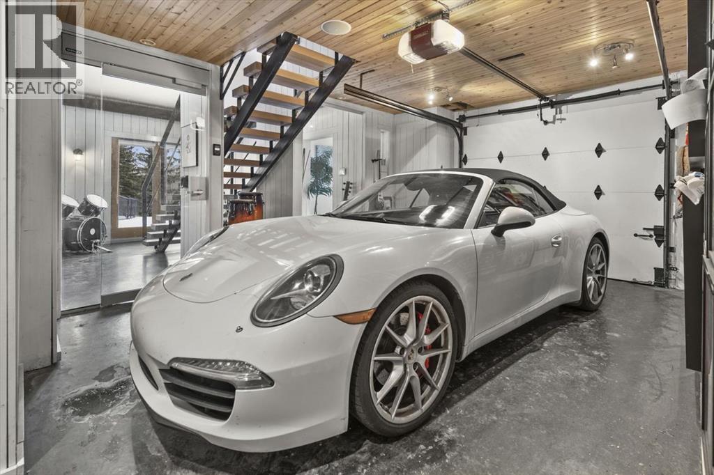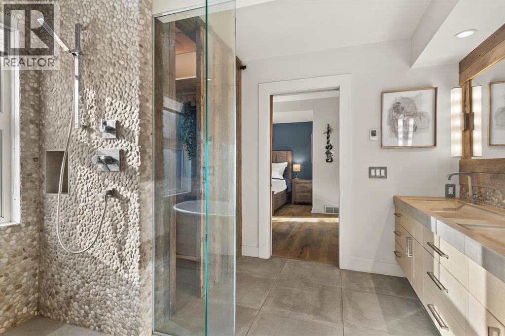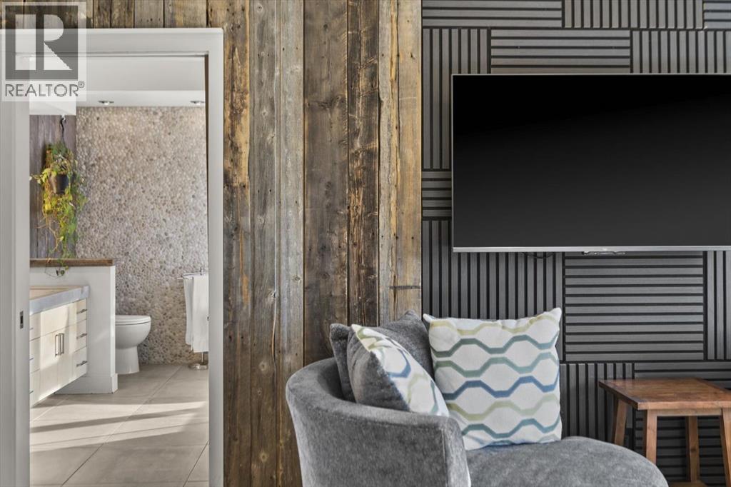 Some homes are designed for function, others for style - this one was designed for something more. Set on just over two acres in Bearspaw, this residence reveals its character the moment you arrive: sweeping curves in the architecture, river rock columns, and a presence that promises there's a story around every corner.Step inside and a circular skylight draws your eye upward, casting light through a graceful rotunda that anchors the home. Those architectural curves continue throughout - in hallways, railings, and built-in niches designed for art and treasured pieces.The main level presents two interconnected living spaces with remarkable flexibility. The larger room, currently configured as an expansive dining area easily seating 14, features soaring ceilings, a river rock fireplace, and walls of windows. The adjacent sitting area offers a more intimate scale. These spaces can easily trade purposes - a generous living room with traditional dining to the side, or kept as designed for those who entertain on a grand scale.Throughout the home, reclaimed barn-board sourced from England creates warmth against contemporary elements - concrete countertops, sleek fixtures, clean architectural lines. It's a considered contrast that feels both grounded and refined. The kitchen embodies this aesthetic, aged wood cabinetry meeting industrial concrete surfaces, a breakfast nook tucked into the window.The primary suite offers a spa-inspired ensuite with pebble stone walls, open shower, and deep soaker tub. Two additional bedrooms, family bathroom and laundry facilities share the upper level, accessed from curved hallways with a striking circular opening overlooking the rotunda.The walkout level opens to casual gathering space, a fourth bedroom, bathroom, exercise area and a very unique dual wine cellar and cigar humidor. A glass breezeway connects the main house to a secondary garage with self-contained guest suite above - Murphy beds and lounge space equally suited a s creative studio or home office. For the collector: a separate garage bay accessed by fingerprint recognition, purpose-built for a prized vehicle.Outside, the property unfolds with equal intention. In-ground pool, hot tub, and firepit create spaces for every season. Circling a stone platform at the heart of the grounds, a moat crossed by two wooden bridges - a meditative feature that speaks to the thoughtfulness woven throughout.For the right person, this won't simply be a beautiful property. It will feel like home. (id:51913)