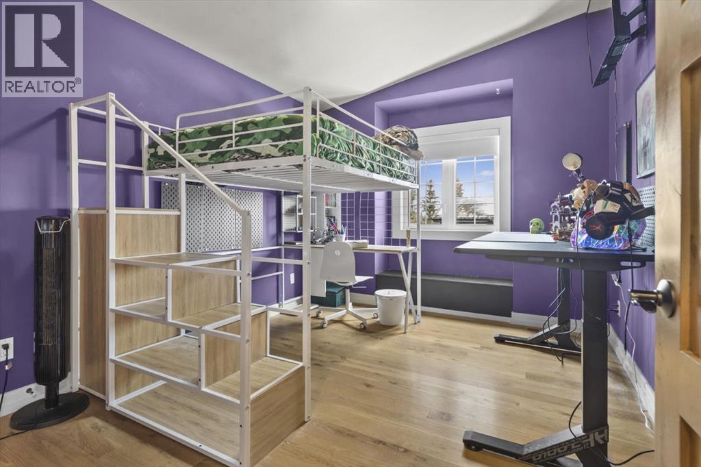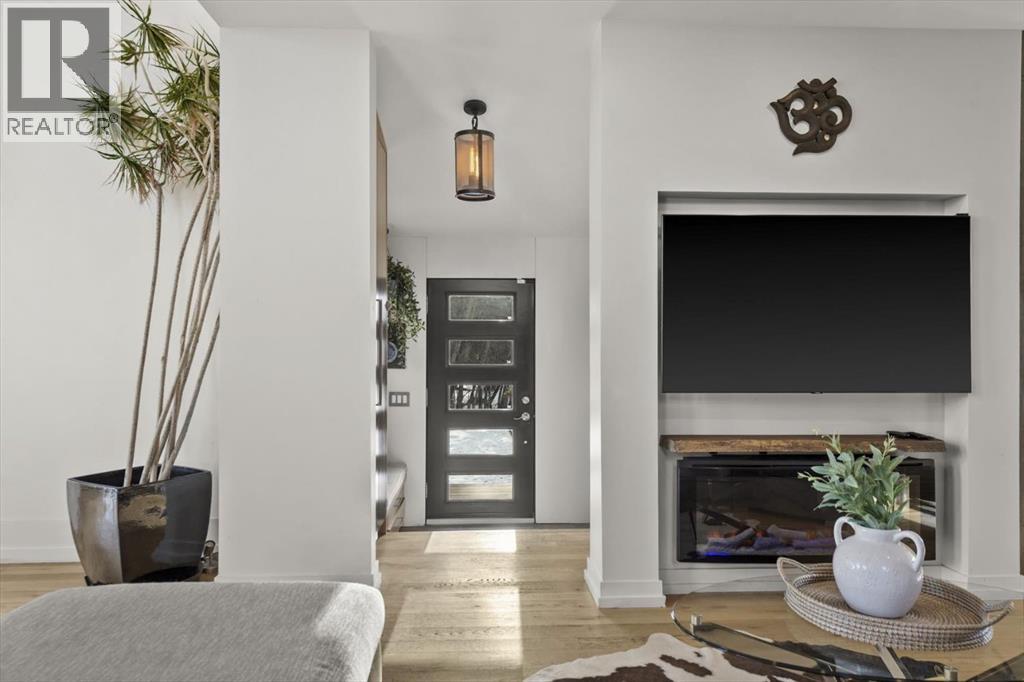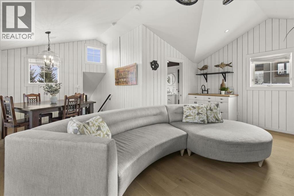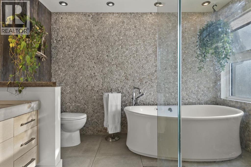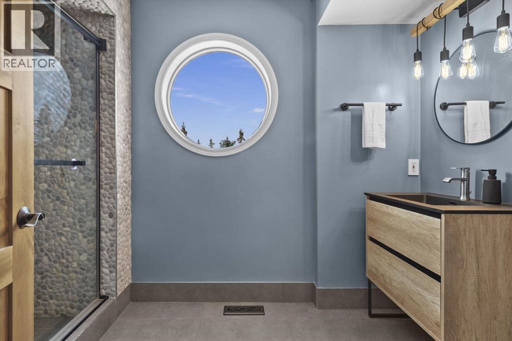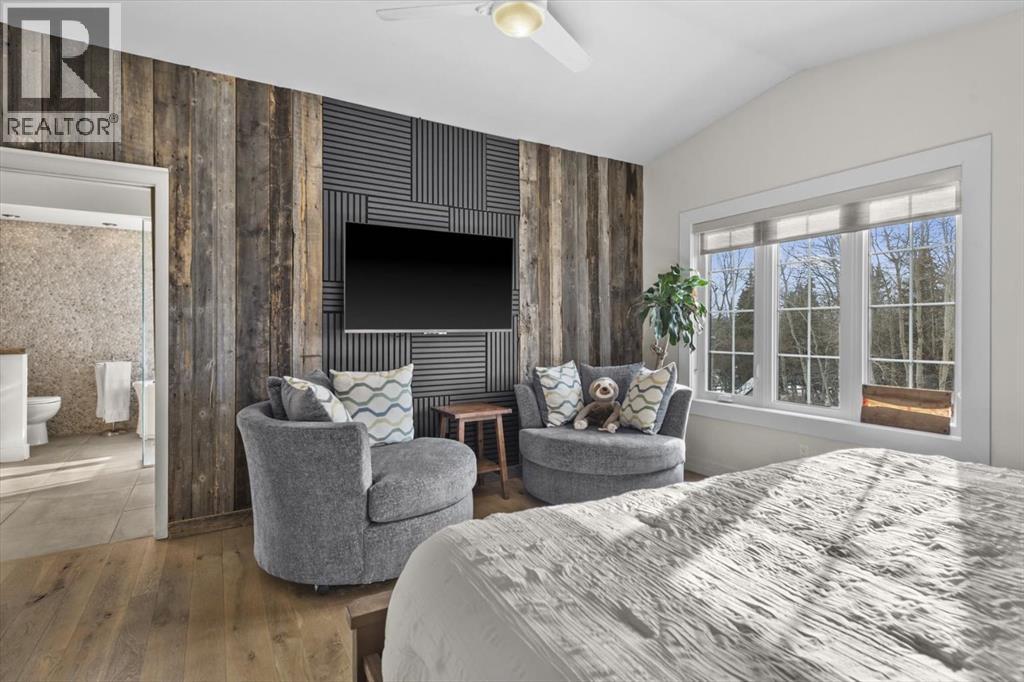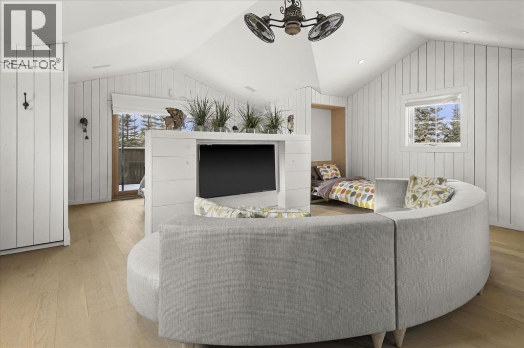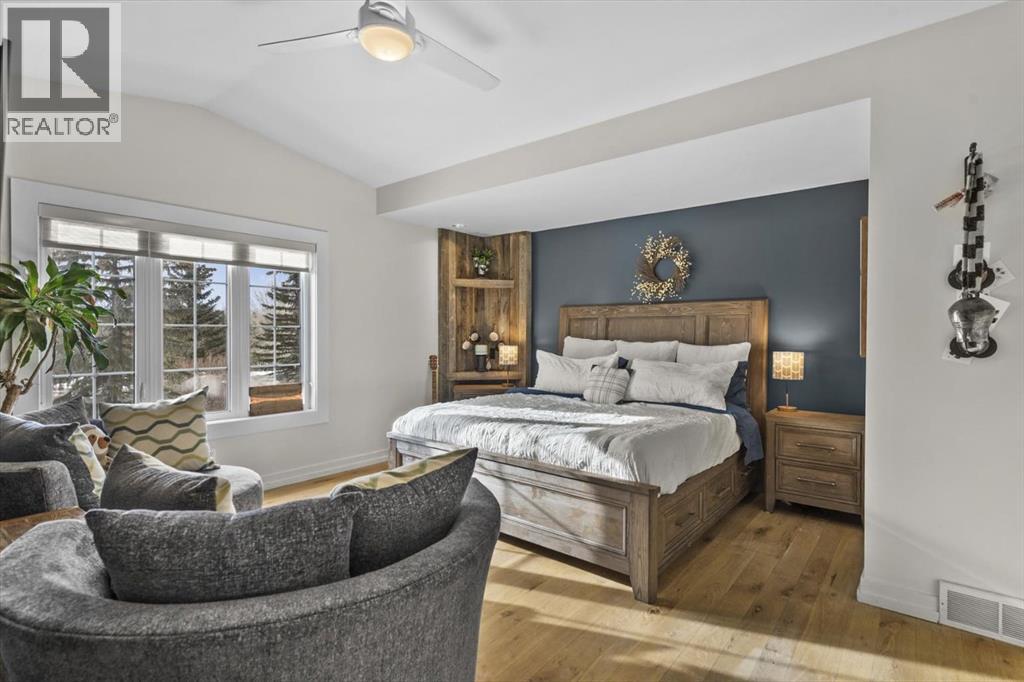 Some homes are designed for function, others for style - this one was designed for something more. Set on just over two acres in Bearspaw, this residence reveals its character the moment you arrive: sweeping curves in the architecture, river rock columns, and a presence that promises there's a story around every corner.Step inside and a circular skylight draws your eye upward, casting light through a graceful rotunda that anchors the home. Those architectural curves continue throughout - in hallways, railings, and built-in niches designed for art and treasured pieces.The main level presents two interconnected living spaces with remarkable flexibility. The larger room, currently configured as an expansive dining area easily seating 14, features soaring ceilings, a river rock fireplace, and walls of windows. The adjacent sitting area offers a more intimate scale. These spaces can easily trade purposes - a generous living room with traditional dining to the side, or kept as designed for those who entertain on a grand scale.Throughout the home, reclaimed barn-board sourced from England creates warmth against contemporary elements - concrete countertops, sleek fixtures, clean architectural lines. It's a considered contrast that feels both grounded and refined. The kitchen embodies this aesthetic, aged wood cabinetry meeting industrial concrete surfaces, a breakfast nook tucked into the window.The primary suite offers a spa-inspired ensuite with pebble stone walls, open shower, and deep soaker tub. Two additional bedrooms, family bathroom and laundry facilities share the upper level, accessed from curved hallways with a striking circular opening overlooking the rotunda.The walkout level opens to casual gathering space, a fourth bedroom, bathroom, exercise area and a very unique dual wine cellar and cigar humidor. A glass breezeway connects the main house to a secondary garage with self-contained guest suite above - Murphy beds and lounge space equally suited a s creative studio or home office. For the collector: a separate garage bay accessed by fingerprint recognition, purpose-built for a prized vehicle.Outside, the property unfolds with equal intention. In-ground pool, hot tub, and firepit create spaces for every season. Circling a stone platform at the heart of the grounds, a moat crossed by two wooden bridges - a meditative feature that speaks to the thoughtfulness woven throughout.For the right person, this won't simply be a beautiful property. It will feel like home. (id:51913)