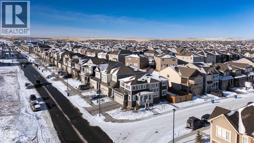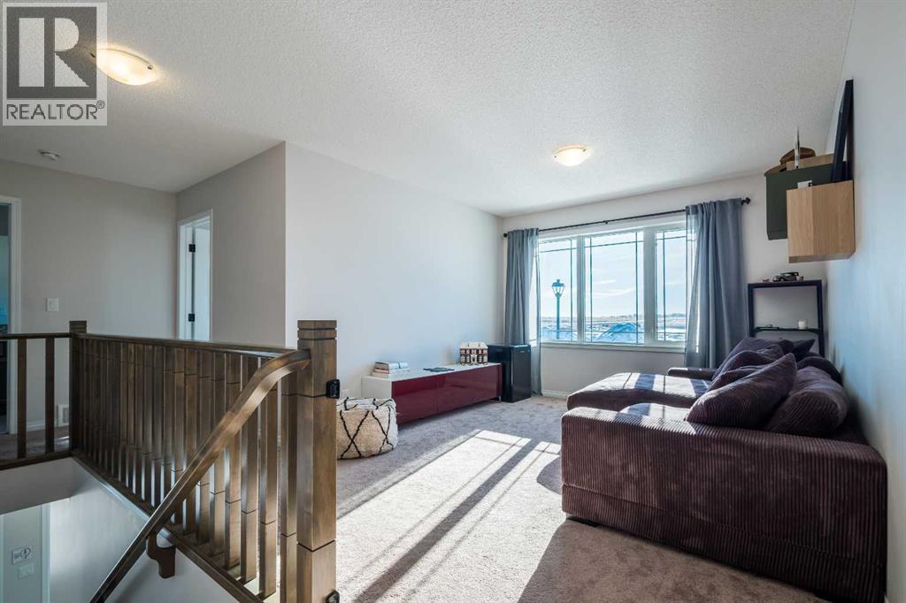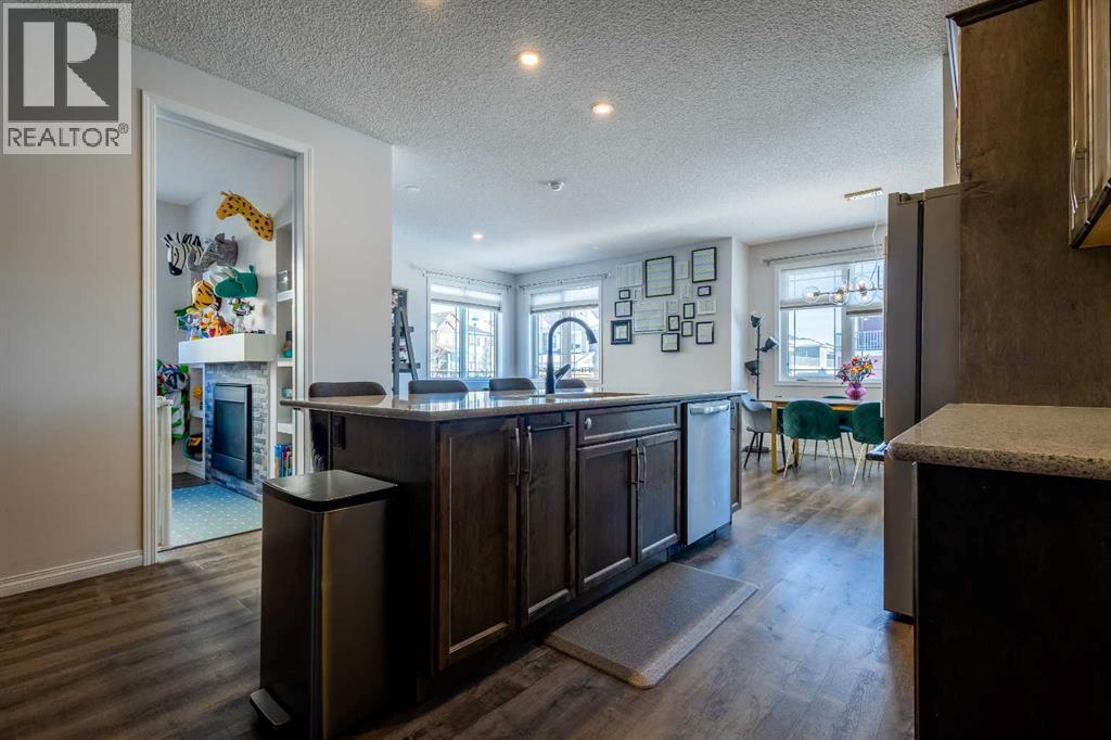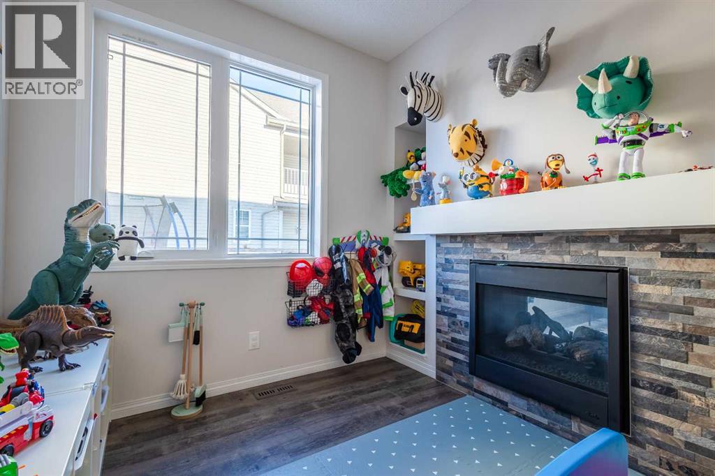 This beautifully maintained corner home is filled with natural light and thoughtfully designed to maximize space, flow, and everyday functionality. With windows on multiple exposures, soaring 9-foot ceilings, and 8-foot doors with transom details, the home feels bright, open, and welcoming from the moment you step inside.A spacious foyer opens to luxury vinyl plank flooring that runs throughout the main level. The kitchen is both stylish and practical, offering expansive quartz countertops, stainless steel appliances, and generous cabinetry—ideal for daily living and entertaining. The oversized dining area flows seamlessly into the open-concept living space, where a dual-sided gas fireplace adds warmth and definition. Large glass doors lead to a fully fenced backyard and deck, extending the living space outdoors.A main-floor office enjoys the glow of the dual-sided fireplace, creating a comfortable work-from-home environment. A functional mudroom provides access to the insulated, drywalled double attached garage, while the large driveway offers excellent additional parking—an added benefit of this corner unit.Upstairs, a sun-filled bonus room is surrounded by walls of windows and accented by a wraparound wood railing, creating a bright and airy retreat. A large upper-level laundry room and linen storage enhance everyday convenience. The primary bedroom comfortably accommodates a king-sized bed and features a walk-in closet and a spa-inspired ensuite with a floating soaker tub, glass walk-in shower, and extra-tall quartz-topped vanity. Two additional generously sized bedrooms and a well-appointed main bath continue the home’s light-filled design.The fully finished lower level, completed by the builder, offers exceptional versatility with a walk-up separate entrance, second laundry area, and wet bar/kitchenette. A spacious fourth bedroom and full four-piece bathroom complete this level, along with a large finished storage room—ideal for guests, extended family , or future suite potential.Located in a vibrant, family-friendly community with multiple playgrounds—including a rock-climbing park—just steps away, as well as nearby shopping, services, and convenient access to major commuter routes. This bright corner home truly stands out and is a must-see. (id:51913)