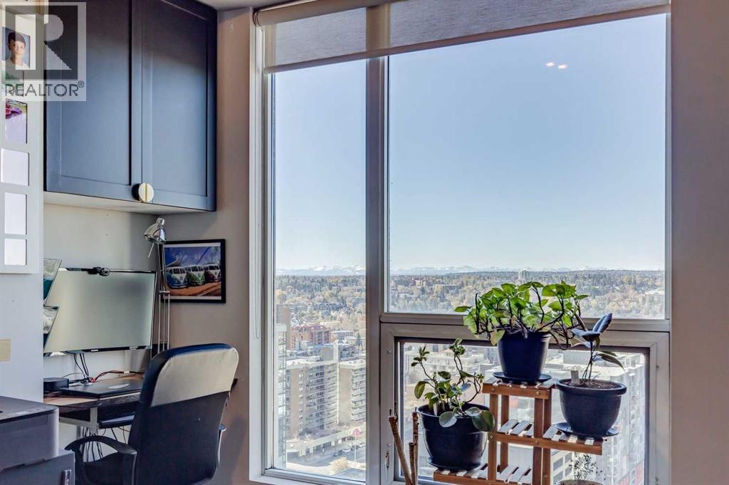 Experience the pinnacle of urban living in this rare sub-penthouse suite at Vantage Pointe. Perched on the 22nd floor with no neighbours on three sides, this residence offers unmatched privacy and breathtaking south and west views that stretch over the city, the river valley, and the Rocky Mountains. From this vantage point, you can watch spectacular sunsets paint the sky each evening — a daily show that never gets old.Step outside onto your private 150 sq. ft. rooftop patio — a true standout feature and an exceptional rarity in the building. Whether it’s morning coffee in the sun or evening cocktails as the mountains glow at dusk, this space is perfect for both entertaining and quiet relaxation.Inside, you’ll find an elegant open-concept layout with 9-foot ceilings, granite countertops, stainless steel appliances, upgraded flooring, and the comfort of newly installed air conditioning — a rare luxury in the building. The versatile second bedroom features a custom Murphy bed, allowing you to easily transition the space between a productive home office and a welcoming guest room.Residents of Vantage Pointe enjoy exceptional value with condo fees that include ALL UTILITIES, plus access to a full-time concierge/security, a fitness centre, and bike storage. A titled underground parking stall adds everyday convenience.Located in the heart of Midtown, you’re just steps from the Midtown Co-op, top schools including Western Canada High School, and an endless array of restaurants, cafés, and shops along 17th Avenue SW.Opportunities like this are exceptionally rare — a sub-penthouse with a private 150 sq. ft. rooftop patio, modern upgrades, and unbeatable sunset views. Don’t miss your chance to call this one home. (id:51913)