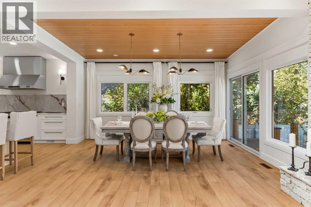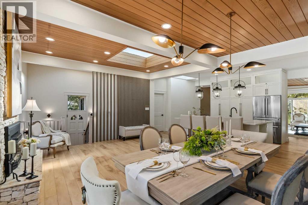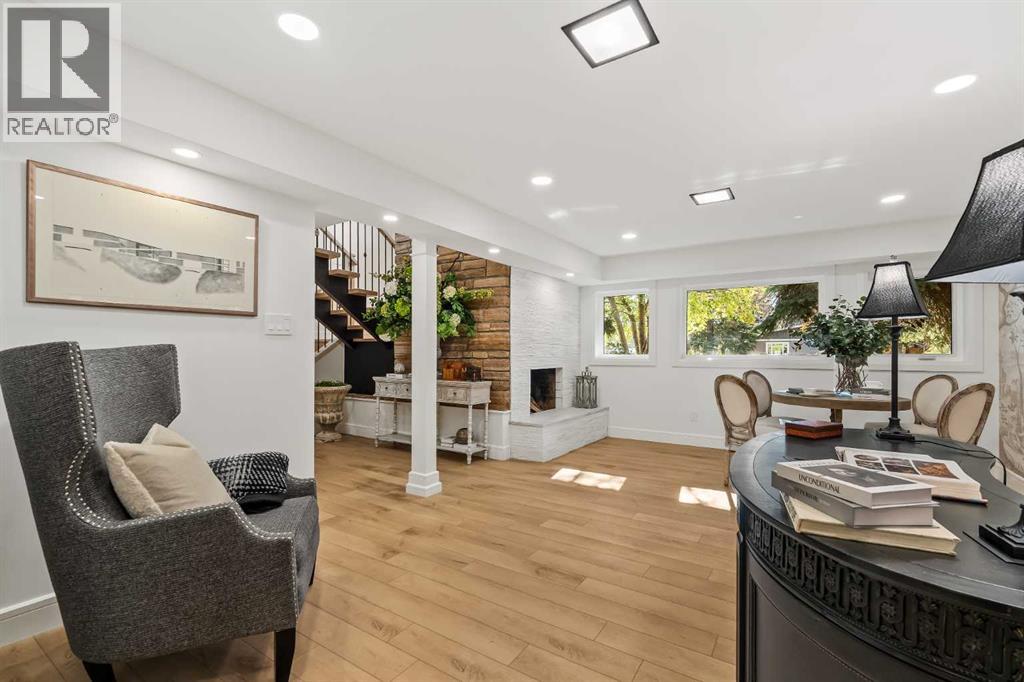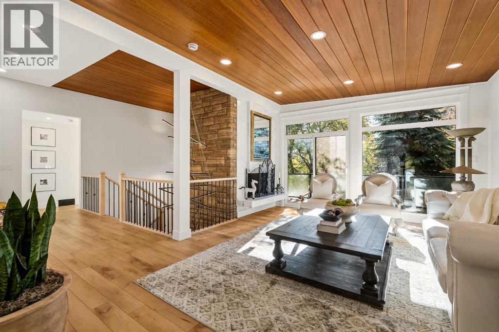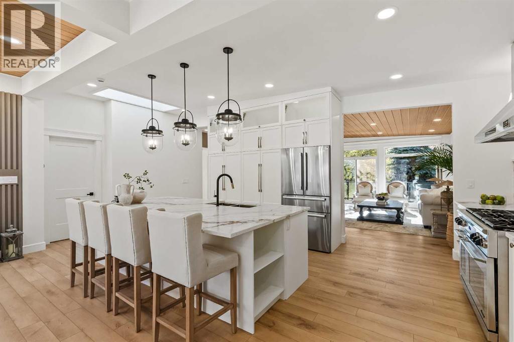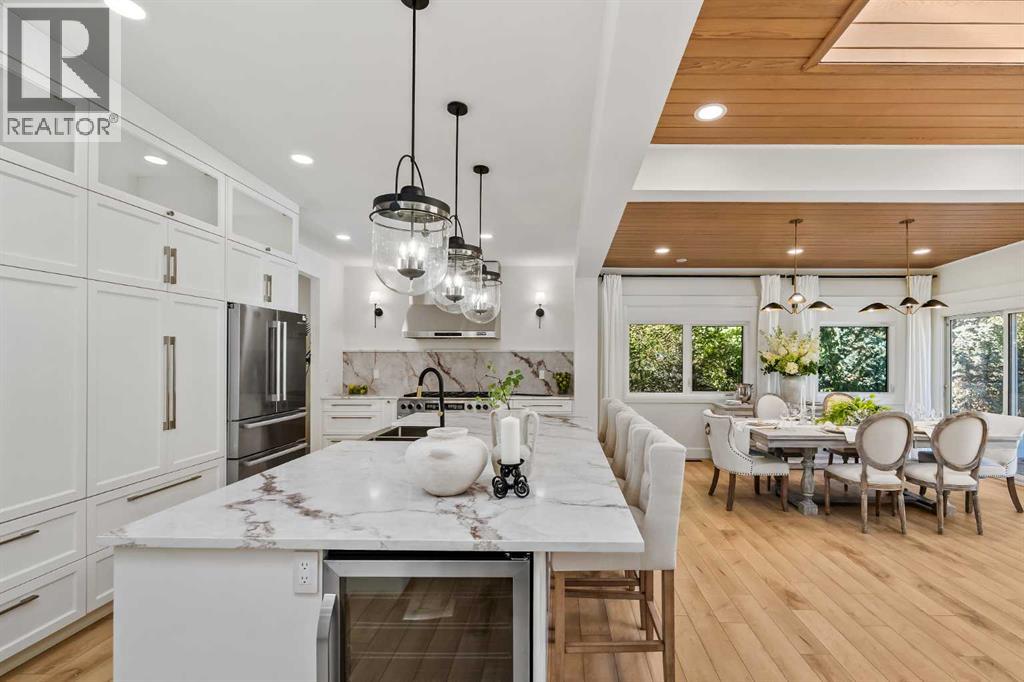 A rare opportunity to live in luxury in this modernized bi-level bungalow in prestigious NW community of University Heights. This home offers nearly 3,300 sq. ft. of living space with abundant natural light, including almost 2,000 sq. ft. on the open-concept main floor featuring an ensuite master bedroom, 2.5 bathrooms, family room, formal dining room, and kitchen all under high ceilings. The gourmet kitchen boasts quartz countertops, a six-burner Dacor gas range, Bosch refrigerator, solid wood cabinetry, and a built-in wine fridge—perfect for entertaining. The primary suite is a private retreat with a walk-in closet and spa-inspired 5-piece ensuite, complete with dual sinks, soaker tub, and a walk-in shower. Cozy up by one of the two main-floor fireplaces (gas + wood-burning).The Lower Level is a light-filled space with all large windows above grade, a fourth bedroom, a full bathroom, a wine cellar, and a third fireplace. The flexible layout is ideal for a home gym, movie theatre, or children’s play area.The landscaped yard is a private oasis with mature trees, apple tree, raspberries, and blueberries. This home has undergone comprehensive renovations with brand new windows, doors, electrical panel, modern lighting, and an added second furnace. The tandem 2-car garage has a rough-in EV charger. Development and building permits for an additional single-car garage off the back lane are included.?Enjoy access to Calgary’s top amenities, just minutes from the University of Calgary, Westmount Charter School, Foothills Hospital, the new Cancer Centre, Alberta Children’s Hospital, and the University District. This move-in ready home is truly a gem in a highly sought-after neighborhood! (id:51913)