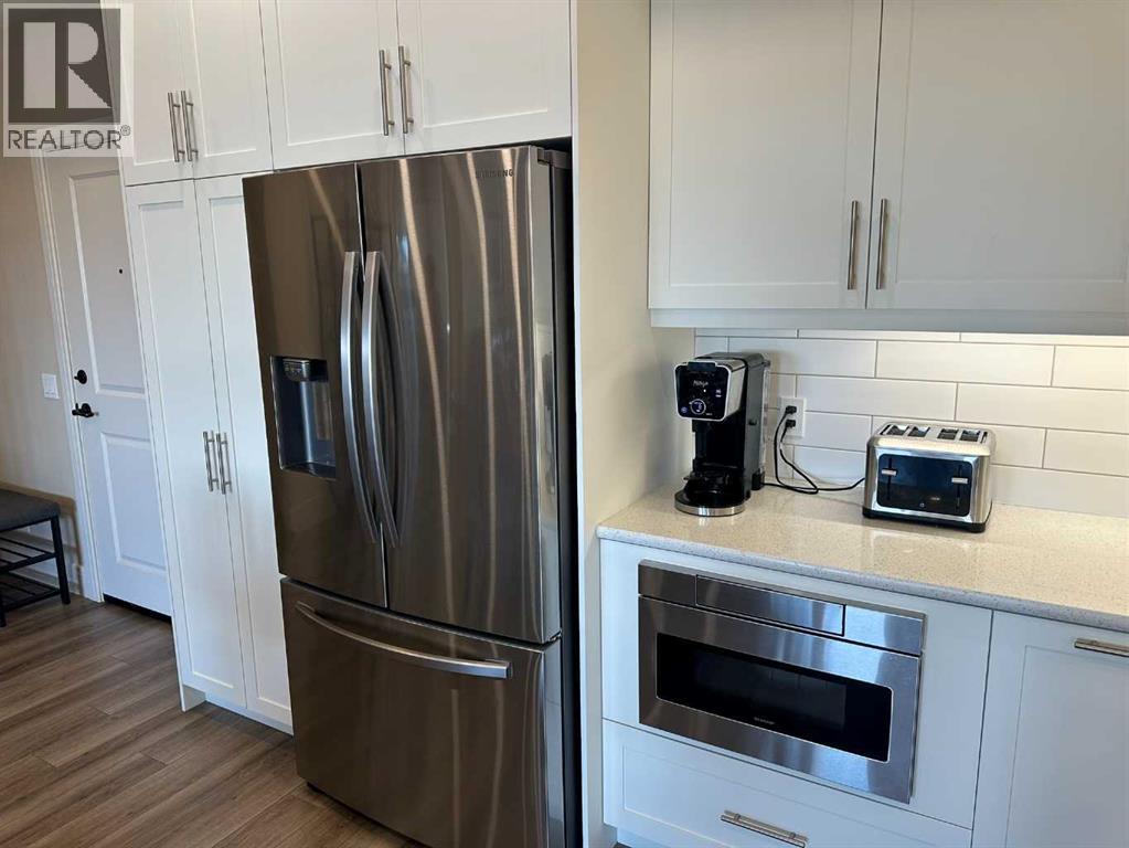 Welcome to Sanderson Ridge — proudly recognized as the Canadian Condominium Institute – South Alberta Chapter 2023 “Condo of the Year”! Perfectly nestled along the edge of Fish Creek Park, this award-winning community offers direct access to miles of scenic walking, hiking, and cycling trails — a true nature lover’s paradise right at your doorstep.Step inside this immaculate, like-new suite and you’ll immediately appreciate the thoughtful open-concept design, soaring 9.5-foot ceilings, and high-end finishes throughout. The spacious foyer leads to a gourmet kitchen featuring quartz countertops, elegant Santino Bianco porcelain tile backsplash, Blanco Precis double undermount sink, and a full suite of premium stainless steel appliances including a gas range, stainless hood fan, Bosch dishwasher, microwave drawer, and French-door refrigerator with water and ice.The inviting living area opens to a generous private balcony — ideal for your morning coffee or an evening barbecue, complete with a natural gas hookup.Your primary suite offers a peaceful retreat with a spacious walk-through custom closet and a spa-inspired ensuite featuring double sinks and quartz counters. A second bedroom and full bathroom, plus a convenient in-suite laundry with washer and dryer, complete the layout.Enjoy year-round comfort with central air conditioning, and rest easy knowing all utilities are included in the condo fees. This unit is part of the newest wing, completed in 2022, and includes a titled heated underground parking stall with secure storage locker.Sanderson Ridge is renowned for its exceptional amenities — an impressive array that rivals any resort: a swimming pool, hot tub, steam room, fitness area, bowling alley, movie theatre, woodworking shop, craft room, wine cellar, billiards room, and even two car wash bays. The building’s Hardie board siding and tiled roofing showcase the same quality craftsmanship you’ll find throughout this beautiful home.Experience luxury, lifesty le, and community — all in one award-winning address.Welcome home to Sanderson Ridge — Calgary’s premier 40+ adult community. (id:51913)