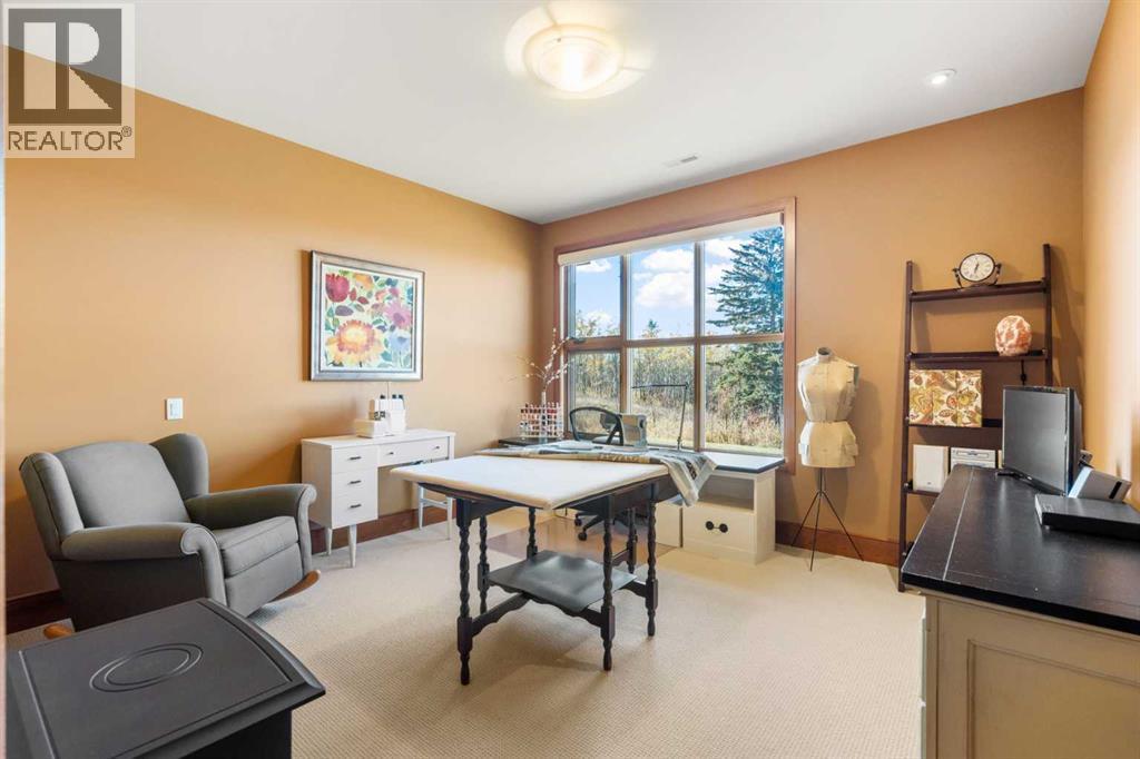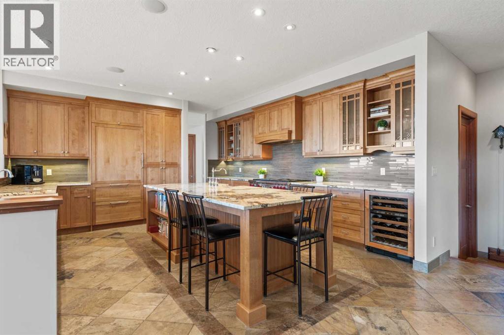 This exceptional, one-of-a-kind property offers the best of Springbank living — privacy, tranquillity, and breathtaking Rocky Mountain views. Set on a picturesque 2.17-acre lot in the heart of Pinnacle Ridge, this walkout bungalow sits high on the ridge, surrounded by beautifully landscaped grounds that provide seclusion from the street and neighbours. Tucked away from main roads, the property features its own private ravine, approximately one acre of mature trees and natural landscape, offering beauty and privacy while minimizing yard maintenance. A circular driveway flanked by mature trees sets the tone from the moment you arrive — this is truly something special. Inside, you’re greeted by stunning mountain vistas and an open layout. The beautifully renovated kitchen features a large island, granite countertops, and high-end appliances, including a Sub-Zero refrigerator, wine fridge, microwave, and 48” Wolf gas range. It opens to a bright dining space and sitting area with access to the large main deck (23' x 22'). The spacious living room, complete with a fireplace, perfectly frames the magnificent mountain backdrop. The main-floor primary suite offers a luxurious six-piece ensuite and a generous walk-in closet. The main level also includes a home office, two powder rooms, a walk-in pantry, and a mudroom that connects to an oversized four-car garage. The 54' x 26' garage (1,279 sq. ft.) is insulated, drywalled, painted, and finished with epoxy flooring, with half the space offering a 12’3” ceiling that is ideal for large trucks or lifts. The walkout lower level features a large recreation room, a wet bar that seats up to ten, a dedicated theatre room, three additional bedrooms, and two full baths. Cherry hardwood and tile flooring flow throughout the home, with wool carpet in the lower-level bedrooms for added comfort. The exterior showcases stucco and stone, complemented by a newer asphalt shingle roof (2020, 50-year warranty). An enclosed under-deck storage roo m is ideal for garden tools or a ride-on mower. This immaculate property has been meticulously maintained by its current owners, with recent mechanical upgrades including two new furnaces with humidifiers (2019) and two new air-conditioning units (2024). A truly remarkable estate combining privacy, panoramic views, and refined living in one of Springbank’s most sought-after locations. (id:51913)