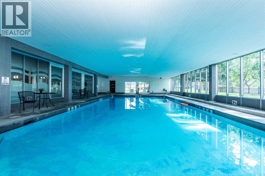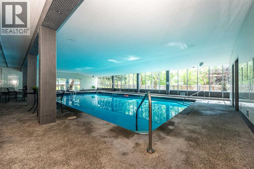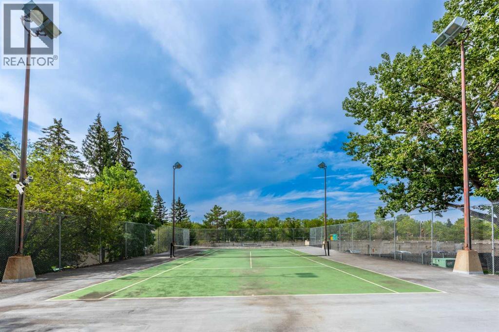This well maintained 2-bedroom, 1-bathroom condo combines comfort, style, and convenience in a prime location. The west-facing balcony fills the space with natural light and offers stunning sunset views, while the layout—with only one shared wall—ensures exceptional privacy. Inside, enjoy a modern kitchen with updated countertops and backsplash, an open-concept living and dining area, a spacious storage room, and a bright 4-piece bathroom with ample cabinet space. The master bedroom features brand-new carpet, and the second bedroom overlooks the outdoor tennis court. The building offers fantastic amenities, including an indoor swimming pool, fitness center, secure indoor bike parking room and outdoor tennis court.. Just one block from the C-Train and close to shopping, parks, and green spaces, this condo is a rare find. (id:51913)