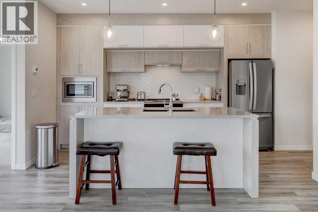 Welcome to 315, 138 Sage Valley Common NW—an exceptional 2-bedroom, 2-bathroom condominium offering luxurious living in the heart of Sage Hill. This is a rare, first-time market offering from the original owner, showcasing meticulous care and pride of ownership. With its unbeatable location, this home effortlessly blends elegance with convenience. As you step inside, you'll be greeted by an open-concept layout, drenched in natural light and featuring a sophisticated neutral color scheme. The luxury vinyl plank flooring creates a seamless flow throughout, while high-end stainless steel appliances, including a full-size front-load washer and dryer, enhance the overall living experience. The kitchen is a chef’s dream, featuring sleek quartz countertops and an oversized island ideal for meal prep and entertaining.Comfort is at the forefront with large windows that fill the space with warmth and light. The spacious living and dining areas provide flexible options for relaxation and hosting. The primary bedroom includes a generous walk thru closet for all your storage needs and a 3-piece bathroom. While the second bedroom and well-appointed 4-piece bathroom create an inviting atmosphere, perfect for guests or as a private office.Step out onto the private balcony, where a gas line for BBQs sets the stage for outdoor dining and gatherings. Additional perks include titled underground parking and a convenient storage locker. This building is ideally located next to a plaza, offering all the amenities you could need, including Co-op Grocery, daycare services, Shoppers Drug Mart, Tim Hortons, restaurants, Anytime Fitness, a gas station, and more—all just steps away. Plus, you’re only 20 minutes from Calgary International Airport and 25 minutes from downtown Calgary, with parks and playgrounds nearby. Don't miss the chance to call this beautiful home yours! (id:51913)