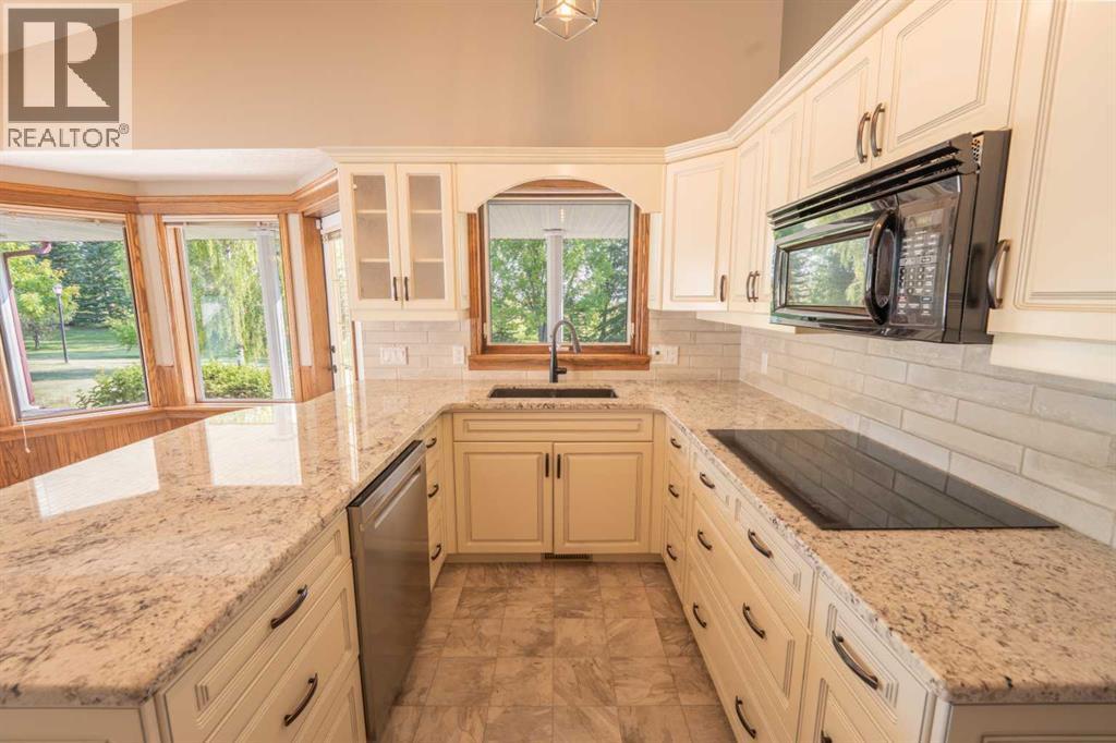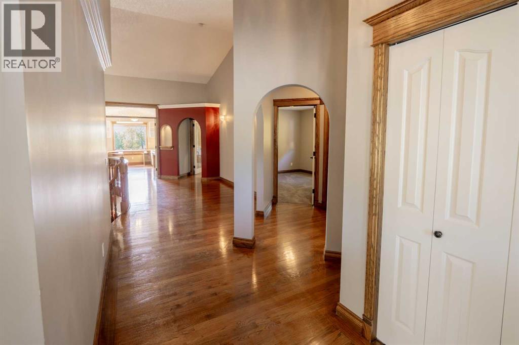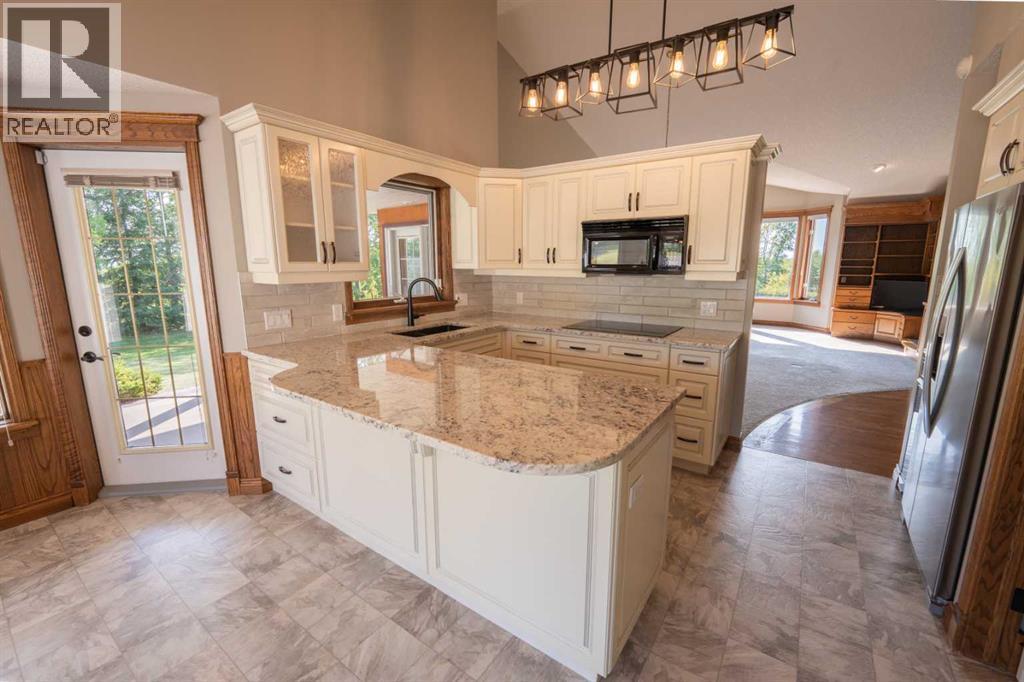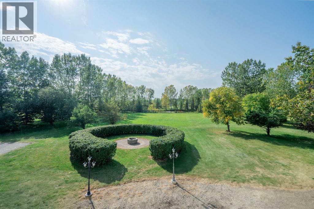 Nestled just north of Okotoks on just under four picturesque, park-like acres, this hillside bungalow offers an exceptional blend of privacy, tranquility, and convenience—only minutes from amenities, schools, and services.A gently curved driveway leads to the inviting wraparound front porch and ample guest parking. Inside, the spacious foyer opens to hardwood floors, soaring vaulted ceilings, and a beautifully designed living and dining area highlighted by a custom entertainment centre and a gas fireplace with mantle. The kitchen features a cozy breakfast nook, oversized pantry, and direct access to the wraparound deck—perfect for outdoor dining and barbecuing. An enclosed sunroom provides additional year-round enjoyment or the option of a greenhouse. The main level is complete with two generously sized bedrooms, including a comfortable primary retreat.The fully developed walkout lower level is designed for family living and entertaining. A curved staircase leads to the expansive billiard and family rooms, complemented by a guest bedroom with ensuite access to a five-piece bath, a hot tub room awaiting your finishing touches, plus an office, bar area, and mechanical room with convenient service access to the garage.Car enthusiasts and hobbyists will appreciate the heated, insulated four-car attached garage, offering abundant space and functionality. Outdoors, mature perimeter trees provide rare privacy, while the gently sloping landscape leads to private retreats, garden areas, and a water dugout that doubles as a charming skating rink in winter.This is a truly special property where peace, space, and nature come together—available for immediate possession. (id:51913)