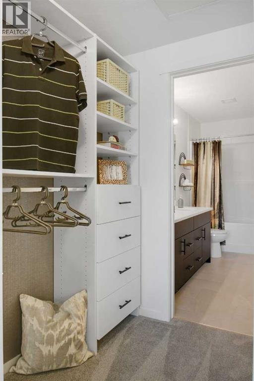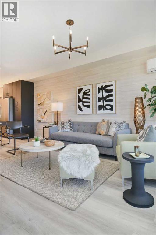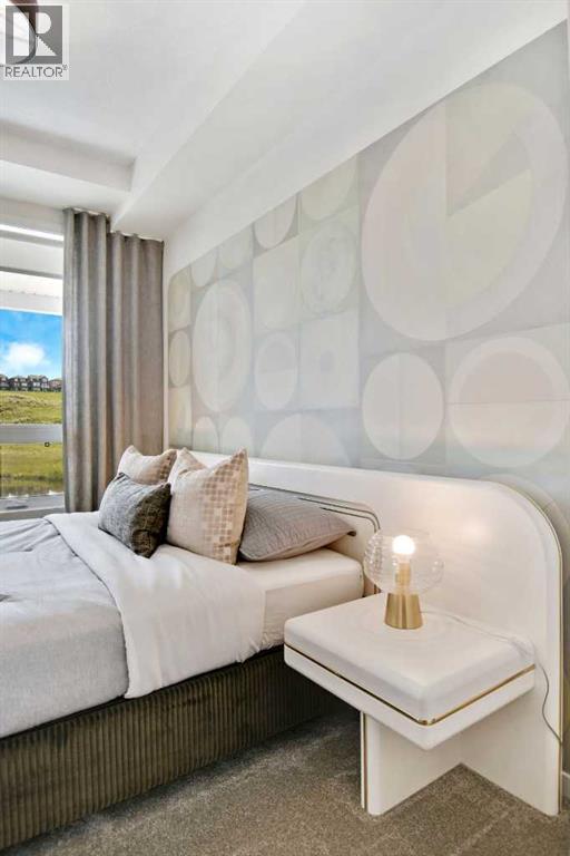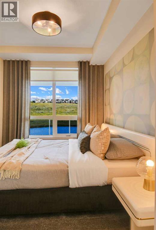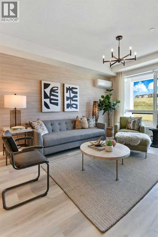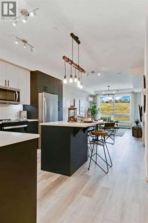 Amazing Views! Must see previous Brad Remington Show Suite Condo in Sage Hill Park II – Introducing the Emerald Plan by Brad Remington Homes. This Luxury One Bedroom , One Bath model in Sage Hill Park II offers modern living space with an oversized patio overlooking the ravines providing incredible sweeping views. The open-concept layout features 9-foot ceilings, oversized windows and patio door, deluxe island, luxury vinyl plank flooring, and air conditioning for year-round comfort. The gourmet kitchen boasts quartz countertops, soft-close cabinetry, and a full stainless steel appliance package, including a fridge, stove, built-in dishwasher, over-the-range microwave, washer, and dryer. The primary bedroom includes a private ensuite with deluxe shower. Bathrooms feature tiled flooring, adding a sleek touch. Included is a titled underground parking stall, an individual storage unit, window coverings, and in-suite laundry. Sage Hill Park II backs onto a beautiful environmental green space and regional bike path. Steps from shopping at Sage Hill Crossing and minutes to Beacon Hill Centre, featuring Costco and more. Enjoy nearby parks, just steps to the ravine pathways, and easy access to Stoney Trail for a quick commute. Everything you need is right at your doorstep! (id:51913)