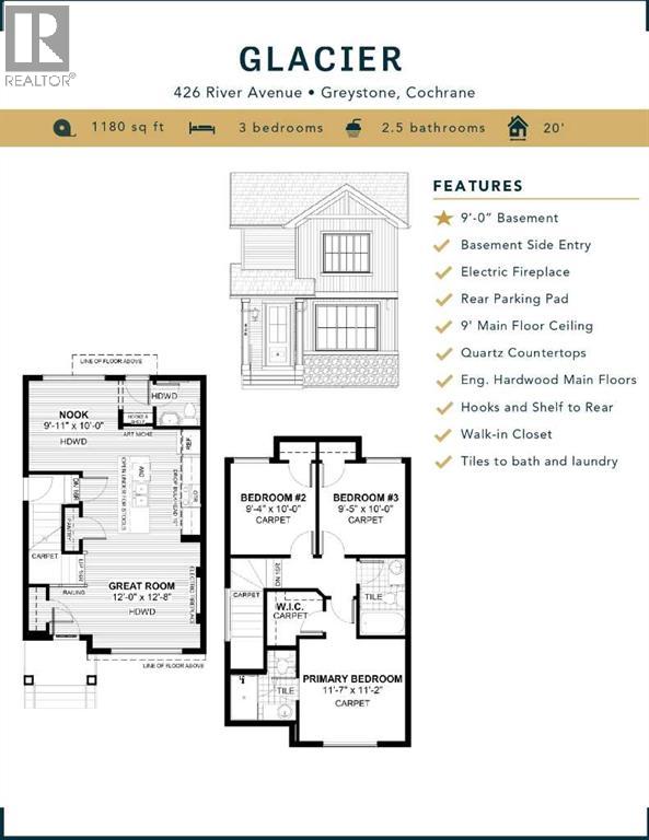 ** Open House at 500 River Avenue - October 1 -2, 6 - 9, 14- 16, 20 - 23, 27 - 30 from 2:15 PM - 7:45 PM & October 4-5, 11 - 13, 18 - 19, 25- 26 from 12:15 PM to 4:30 PM ** NEW PRICING - IMMEDIATE POSSESSION - CONFIRMED BY THE BUILDER. BRAND NEW HOME by Douglas Homes, Master Builder in central Greystone, short walking distance to parks, the Bow River, major shopping & interconnected pathway system. Featuring the Glacier with separate side entry on an R-MX zoned home site for POTENTIAL future lower level suite. NOTE: a secondary suite would be subject to approval and permitting by the city/municipality. This gorgeous 3 bedroom, 2 & 1/2 half bath home offers 1180 sq ft of living space. This home is located on a River Avenue which provides immediate access to the interconnective pathway system, perfect for those looking for a outdoor lifestyle. Loads of upgraded, DESIGNER features in this beautiful, open floor plan. The main floor greets you with a grand, glazed 8' front door & side lite, soaring 9' ceilings, oversized windows , & 8' 0" passage doors. Distinctive Engineered Hardwood floors flow through the Foyer, Hall, Great Room, Kitchen & Nook adding a feeling of warmth & style. The Kitchen is completed with an oversized entertainment island & breakfast bar, closet pantry, Quartz Countertops, 42" Cabinet Uppers accented by closed-in, painted bulkhead above, Bank of Pots & Pans Drawers, soft close doors & drawers throughout, new stainless appliance package including Fridge, Microwave/Hood Fan combo over the stove, smooth top electric Range, & built-in Dishwasher. The main floor is completed with an open Great Room & Nook finished with over height windows, full French Door rear entry & 1/2 bath. Great Room is complimented by a Napoleon "Entice" fireplace. Upstairs you'll find a good sized Primary Bedroom with 3 piece Ensuite including undermounted sink & drawer, Quartz vanity, oversized 5'0" x 3'0" shower with tile accented walls & ceramic tile flooring. There is also a nice sized, walk-in closet accessed from the bedroom. The 2nd floor is completed with two additional good sized bedrooms with roomy double door closets. The 2nd & 3rd bedrooms have easy access to the main the bath with Quartz countertop, undermounted sink with drawer & tile flooring. This is a very popular plan, great for young families, investors or the down sizing crowd. Spacious, Beautiful and Elegant! The perfect place for your perfect home with the Perfect Fit. Call today! Photos are from prior build & are reflective of fit, finish & included features. Note: Front elevation of home & interior photos are for illustration purposes only. Actual elevation style, interior colors/finishes, & upgrades may be different than shown & the Seller is under no obligation to provide them as such. (id:51913)