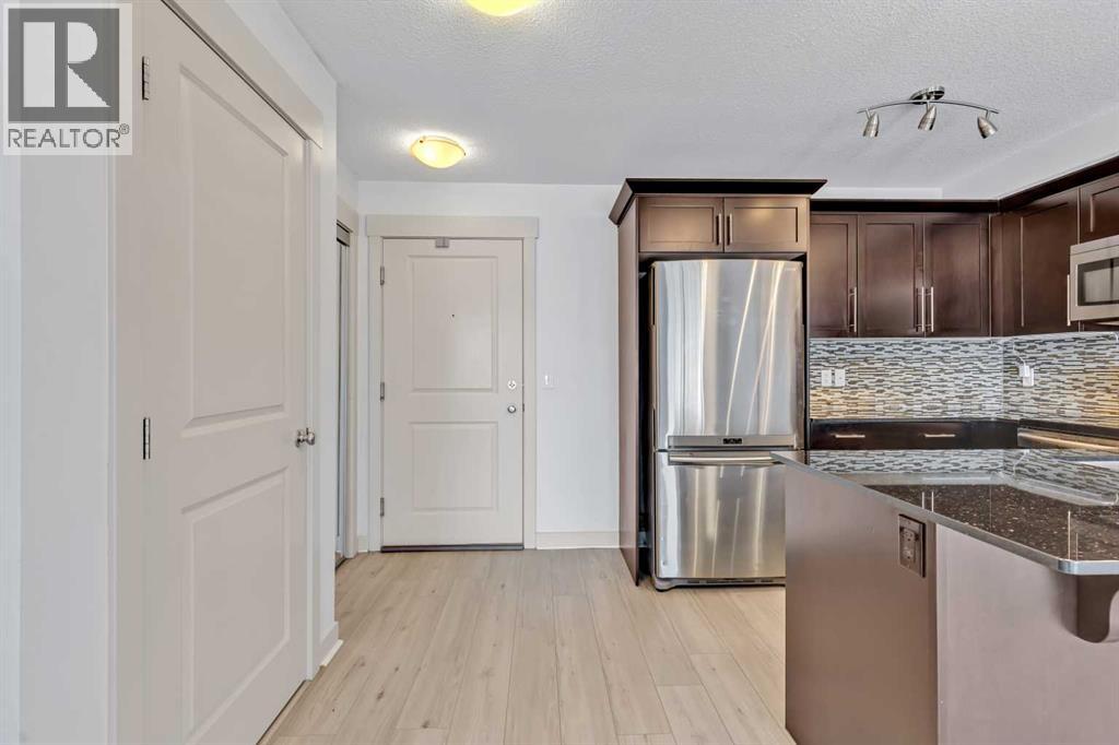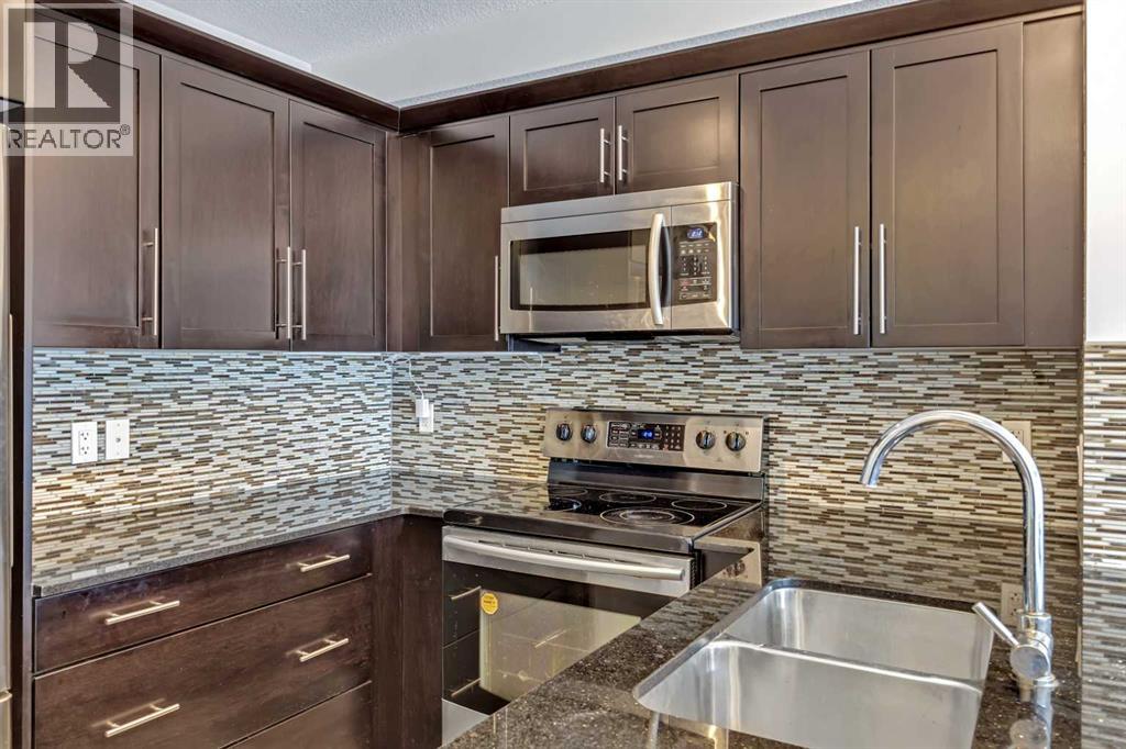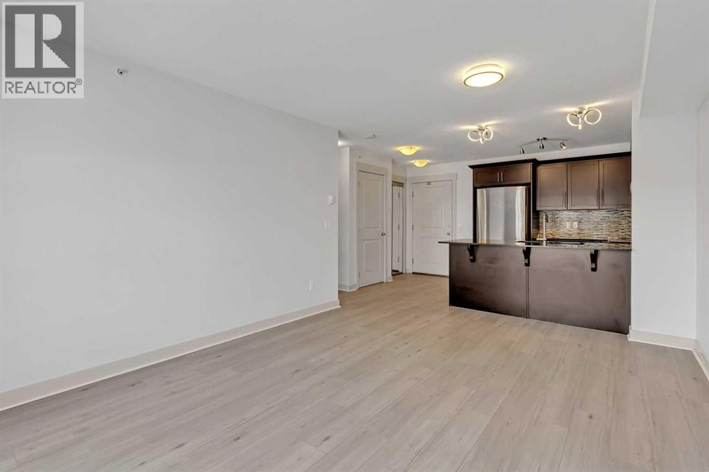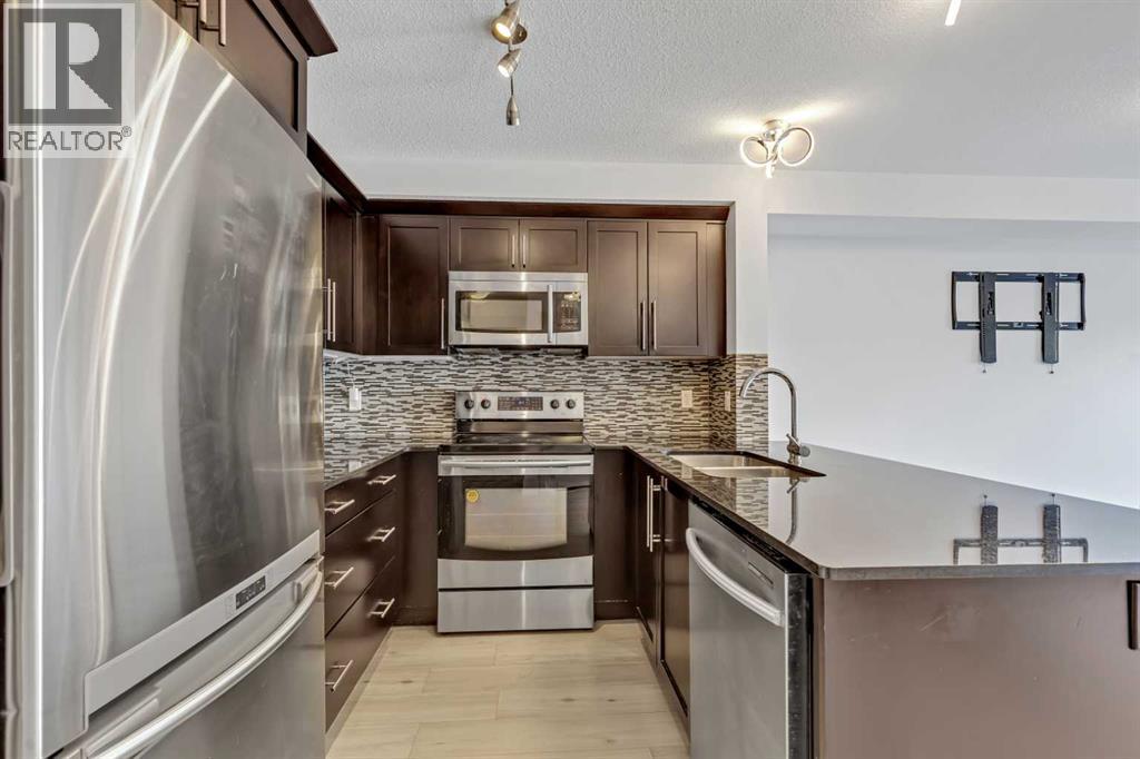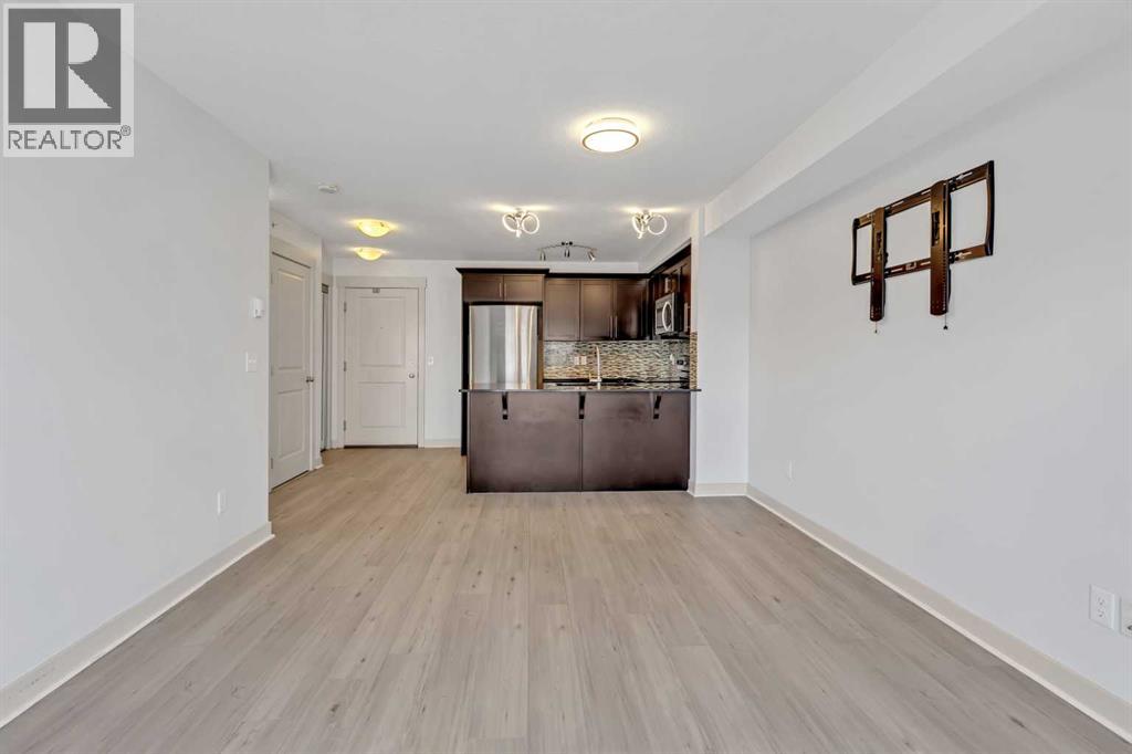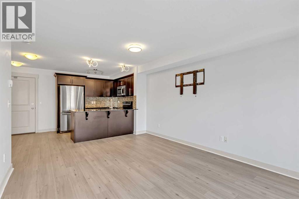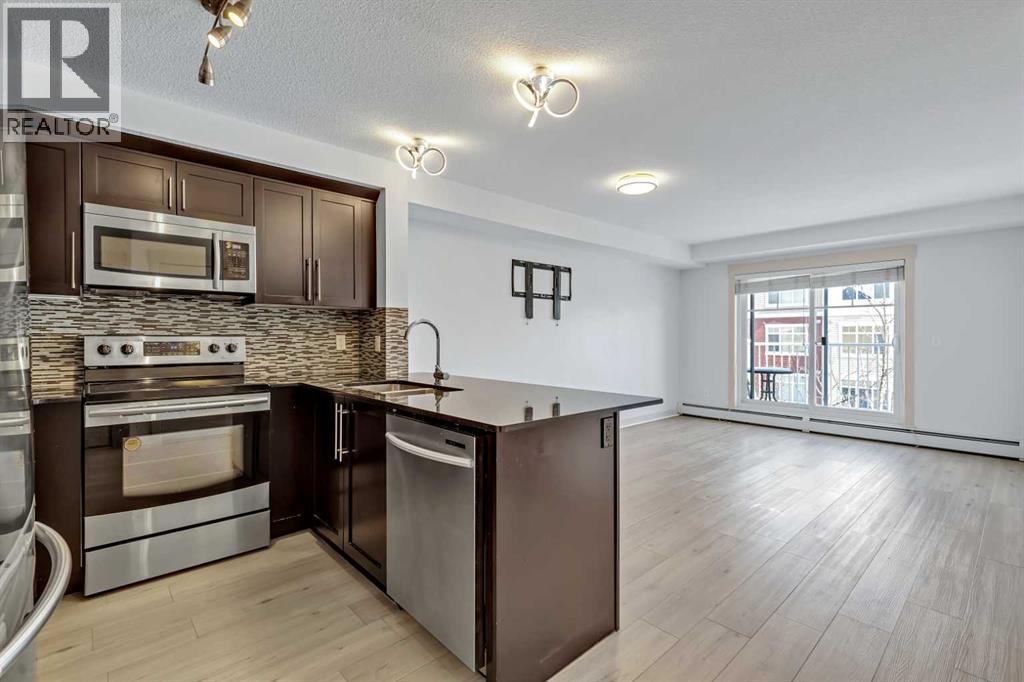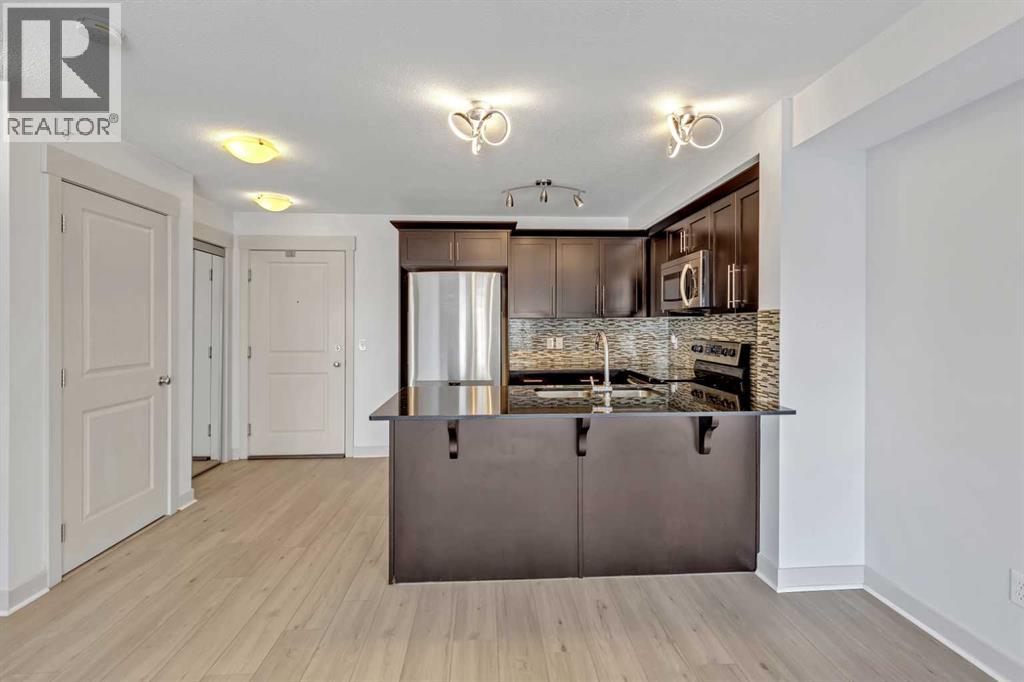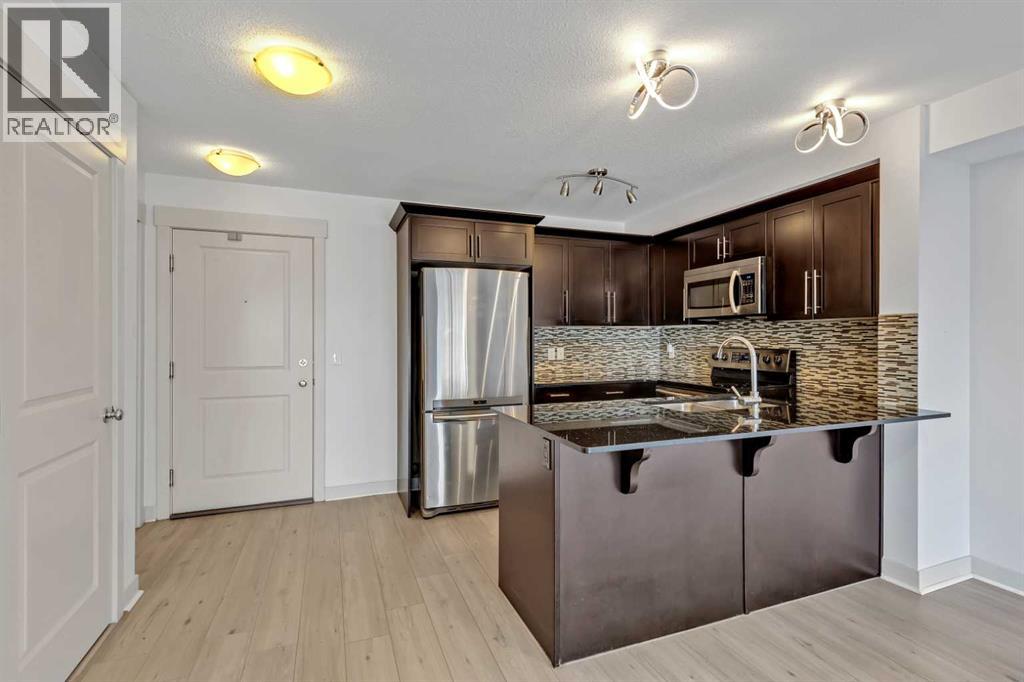 Welcome to SkyWest Condominiums!This immaculate, move-in-ready condo is tucked away in the highly sought-after community of Skyview Ranch, offering the perfect balance of style, comfort, and convenience.Step inside to an inviting open-concept layout bathed in natural light and enhanced by soaring 9-ft ceilings. Durable Luxury Vinyl Plank flooring flows seamlessly through the main living areas, while plush carpet in the spacious primary bedroom adds warmth and comfort.The showpiece kitchen is a true delight, featuring gleaming granite countertops, an undermount sink, ample cabinetry, and a premium stainless steel appliance package. An eat-up breakfast bar provides the ideal spot for quick meals or entertaining guests.Your east-facing balcony is perfect for morning coffee or summer BBQs, complete with a gas hookup. The primary bedroom easily fits a king-size bed and includes a generous walk-in closet. The 4-piece bathroom offers a stylish vessel sink and a relaxing soaker tub.Additional highlights include in-suite laundry, a titled underground parking stall with storage, and plenty of visitor parking. The beautifully landscaped SkyWest complex offers lush green spaces and is just minutes from Metis Trail, Stoney Trail, Calgary International Airport, shopping, and schools. (id:51913)