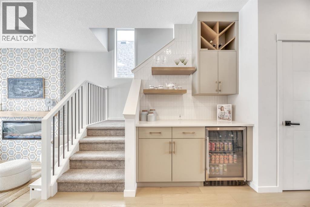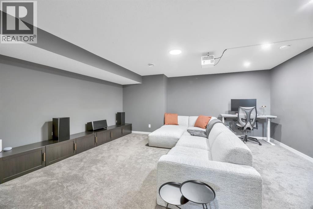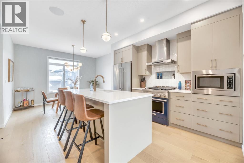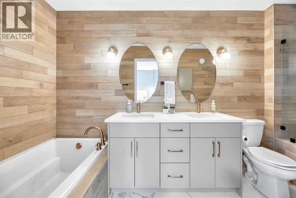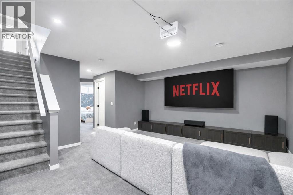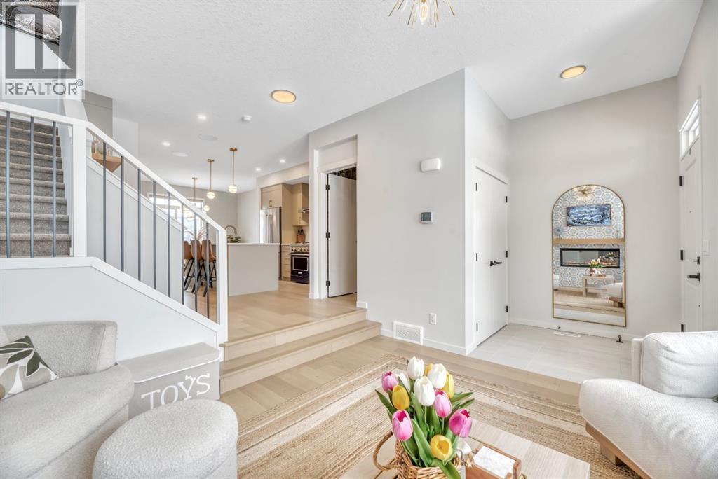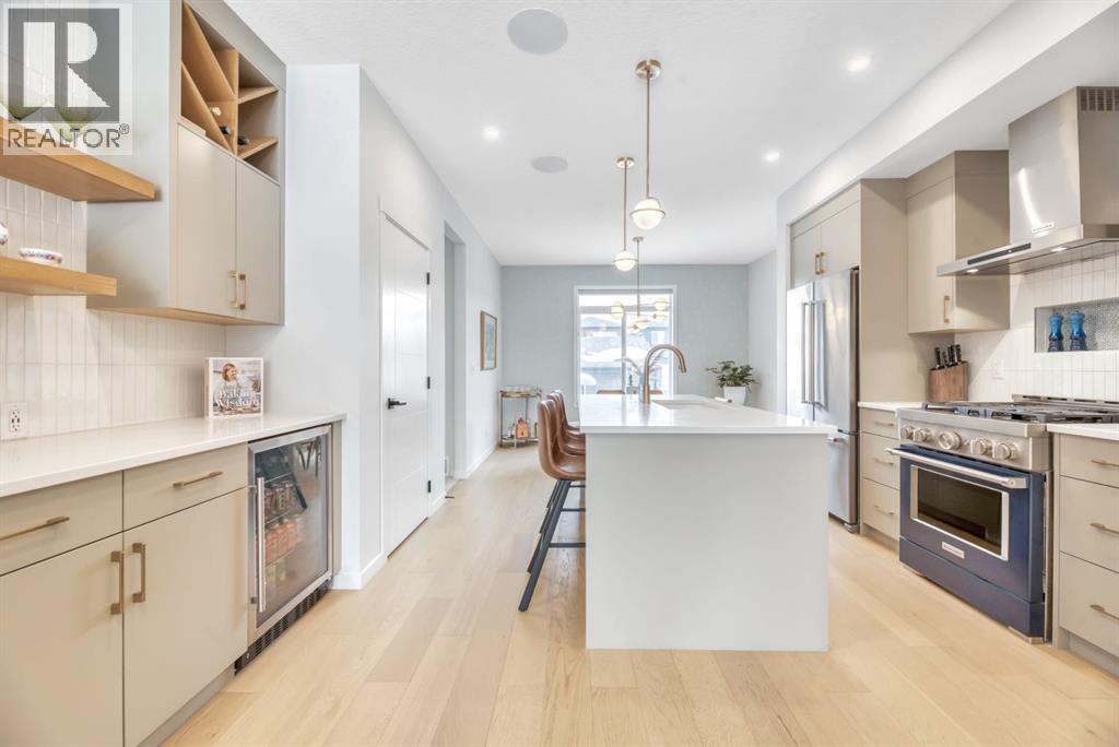 Welcome to an exceptional, fully upgraded Morrison-built residence in the community of Wolf Willow, ideally located steps from Fish Creek Park, scenic pathways, and the Woof Willow dog park. Offering over 2,200 sq. ft. of impeccably finished living space, this home delivers sophisticated design, premium finishes, and a lifestyle rarely found at this price point. Inside, a tiled front entryway sets the tone for the refined interiors, complemented by abundant natural light from numerous oversized, upgraded windows, all dressed with Hunter Douglas light-enhancing sheer shades. The main floor features 9-foot ceilings, with the living room elevated to 10 feet, anchored by a striking floor-to-ceiling tiled fireplace finished with a custom natural oak mantle. Designed with entertaining in mind, the main level includes built-in ceiling speakers throughout, a statement custom dry bar with integrated beverage fridge, oak floating shelves, and an oak wine rack. The chef’s kitchen is both elegant and functional, showcasing KitchenAid appliances, including a smart commercial-style gas range in ink-blue, paneled dishwasher, an impressive 7-foot island, and upgraded white quartz countertops throughout the entire home. White oak engineered hardwood flooring adds warmth and timeless appeal. A designer powder room with moody wallpaper, smart-home Lutron lighting controls throughout, and a generous mudroom with tile flooring, built-in shelving, and shoe storage complete the main level. Upstairs, the primary suite offers a true spa-inspired ensuite, fully tiled in wood-look porcelain with timeless sconce lighting, an oversized soaker tub, and a tiled shower featuring a bench and slide-bar hand shower. Secondary bedrooms are generously proportioned and include custom closet systems. A spacious main bathroom provides abundant storage, while the upgraded upper-level laundry includes premium washer and dryer with additional built-in shelving. The fully developed, purpose-built basement wit h projector is a private entertainment retreat, professionally wired for 15 speakers, creating an immersive home theatre experience. This level also includes a fourth bedroom with 9-foot ceilings and natural light, along with a full third bathroom, ideal for guests or multigenerational living. The south-facing, professionally landscaped backyard provides a private outdoor retreat designed for both entertaining and everyday enjoyment. Features include a modern stone patio (15ft. x 18ft.), a stone walkway (4ft. x 13ft.) leading to the double detached garage, washed rock dog run, and curated mulch garden beds. The double detached garage offers additional storage capacity without compromising functionality. Refined, turnkey, and meticulously upgraded, this Wolf Willow residence offers luxury living with immediate access to Calgary’s most iconic green spaces — a rare opportunity to own a home where design, lifestyle, and location converge. (id:51913)