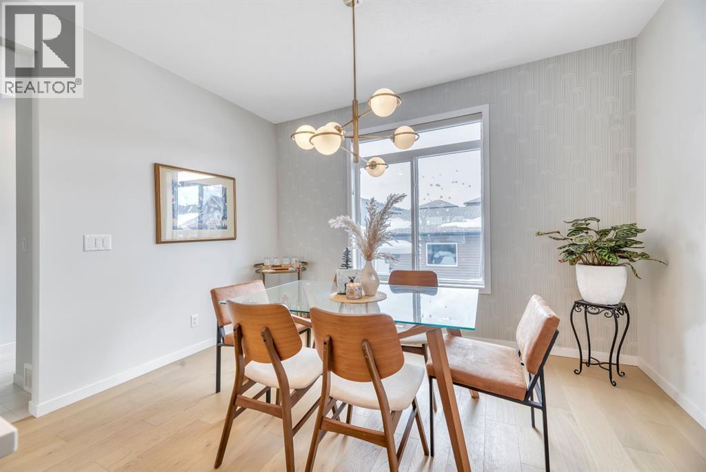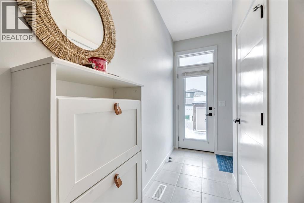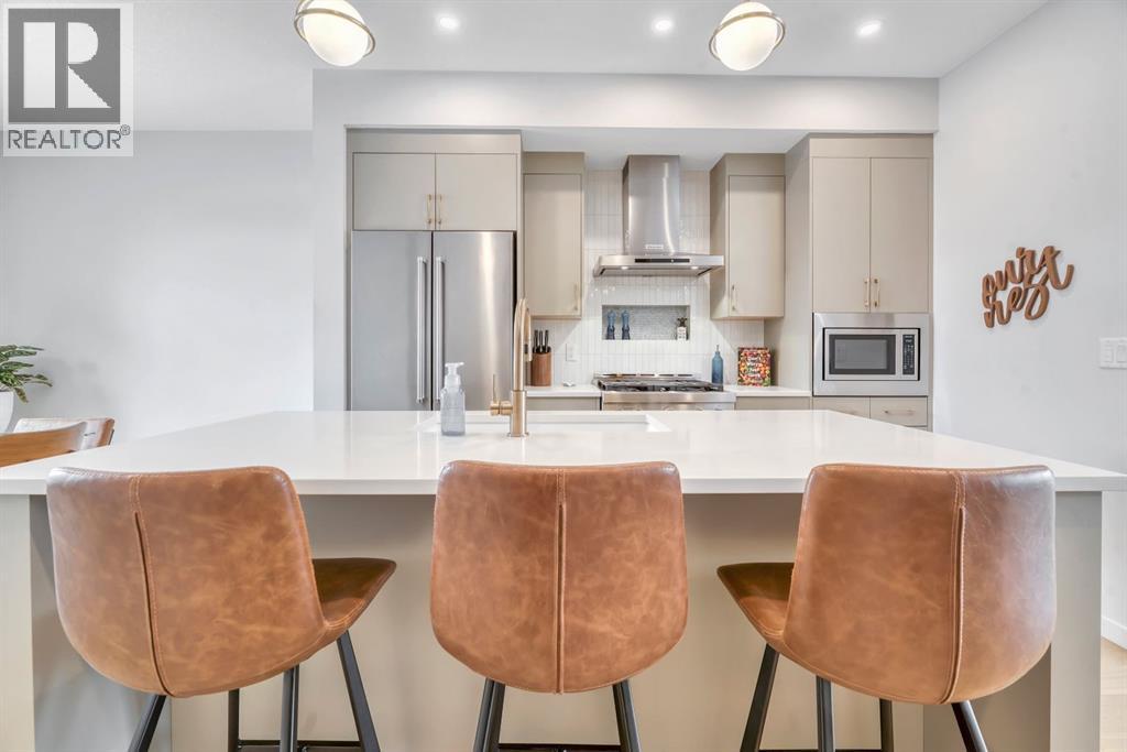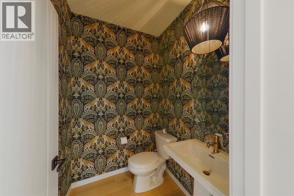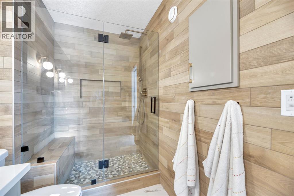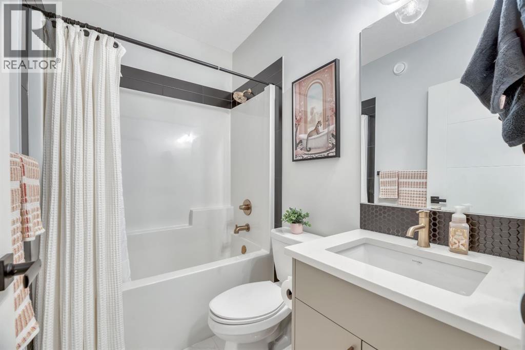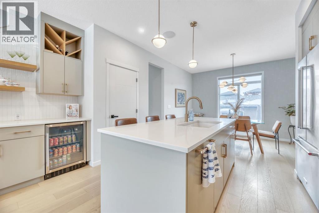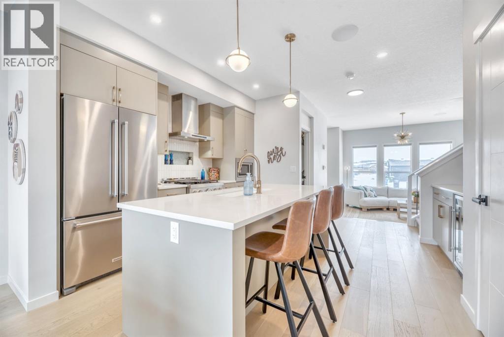Welcome to an exceptional, fully upgraded Morrison-built residence in the community of Wolf Willow, ideally located steps from Fish Creek Park, scenic pathways, and the Woof Willow dog park. Offering over 2,200 sq. ft. of impeccably finished living space, this home delivers sophisticated design, premium finishes, and a lifestyle rarely found at this price point. Inside, a tiled front entryway sets the tone for the refined interiors, complemented by abundant natural light from numerous oversized, upgraded windows, all dressed with Hunter Douglas light-enhancing sheer shades. The main floor features 9-foot ceilings, with the living room elevated to 10 feet, anchored by a striking floor-to-ceiling tiled fireplace finished with a custom natural oak mantle. Designed with entertaining in mind, the main level includes built-in ceiling speakers throughout, a statement custom dry bar with integrated beverage fridge, oak floating shelves, and an oak wine rack. The chef’s kitchen is both elegant and functional, showcasing KitchenAid appliances, including a smart commercial-style gas range in ink-blue, paneled dishwasher, an impressive 7-foot island, and upgraded white quartz countertops throughout the entire home. White oak engineered hardwood flooring adds warmth and timeless appeal. A designer powder room with moody wallpaper, smart-home Lutron lighting controls throughout, and a generous mudroom with tile flooring, built-in shelving, and shoe storage complete the main level. Upstairs, the primary suite offers a true spa-inspired ensuite, fully tiled in wood-look porcelain with timeless sconce lighting, an oversized soaker tub, and a tiled shower featuring a bench and slide-bar hand shower. Secondary bedrooms are generously proportioned and include custom closet systems. A spacious main bathroom provides abundant storage, while the upgraded upper-level laundry includes premium washer and dryer with additional built-in shelving. The fully developed, purpose-built basement wit h projector is a private entertainment retreat, professionally wired for 15 speakers, creating an immersive home theatre experience. This level also includes a fourth bedroom with 9-foot ceilings and natural light, along with a full third bathroom, ideal for guests or multigenerational living. The south-facing, professionally landscaped backyard provides a private outdoor retreat designed for both entertaining and everyday enjoyment. Features include a modern stone patio (15ft. x 18ft.), a stone walkway (4ft. x 13ft.) leading to the double detached garage, washed rock dog run, and curated mulch garden beds. The double detached garage offers additional storage capacity without compromising functionality. Refined, turnkey, and meticulously upgraded, this Wolf Willow residence offers luxury living with immediate access to Calgary’s most iconic green spaces — a rare opportunity to own a home where design, lifestyle, and location converge. (id:51913)