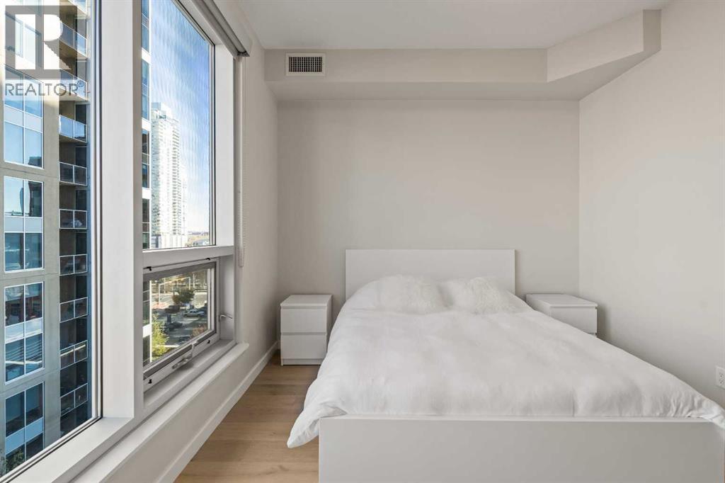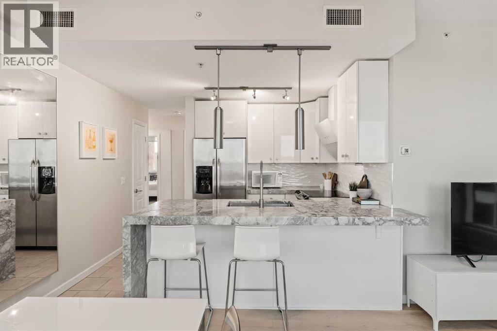 Welcome to Alura, where timeless elegance meets contemporary design in this fully renovated condo. This beautifully updated property features 2 bedrooms, 2 bathrooms and TWO Titled Parking Stalls - a very rare offering for a Beltline condo! This property redefines luxury urban living in the heart of downtown Calgary. The bright kitchen features mitred-edge marble countertops with a dramatic waterfall finish, a custom Italian-engineered hood fan, and full-height high-gloss cabinetry that provides both beauty and functionality. Resilient tile flooring flows throughout the main entry, hallway and kitchen, with updated hardwood flooring throughout the living space and bedrooms. The open-concept living and dining areas are flooded with natural light and offer stunning panoramic city views, including breathtaking morning sunrises that illuminate the skyline and views of downtown Calgary from both the living area and primary bedroom. The full dining space + island peninsula seating makes hosting and entertaining that much easier and more comfortable. The primary suite is a true retreat, complete with captivating downtown views, a fully customized walk-in closet, and a luxurious 4-piece ensuite with updated vanity and granite countertops. A second bedroom which is located at the opposite end of the condo for optimal privacy, and full bathroom make this layout ideal for guests, a home office, or shared living. Step outside to your private, fully covered balcony - an all-season outdoor oasis perfect for morning coffee, evening wine, or year-round barbecues. Additional features include 2 Titled underground heated parking stalls (providing rental income for a stall if only one is needed), a secure storage locker, and access to Alura’s premier amenities including concierge and a full gym. Located in an amenity-rich building with easy access to the downtown core, 17th Avenue and endless restaurants and retail options nearby, this property is ideal for young professionals or inves tors. This home offers the perfect balance of sophistication, comfort, and convenience - everything downtown living is meant to be. (id:51913)