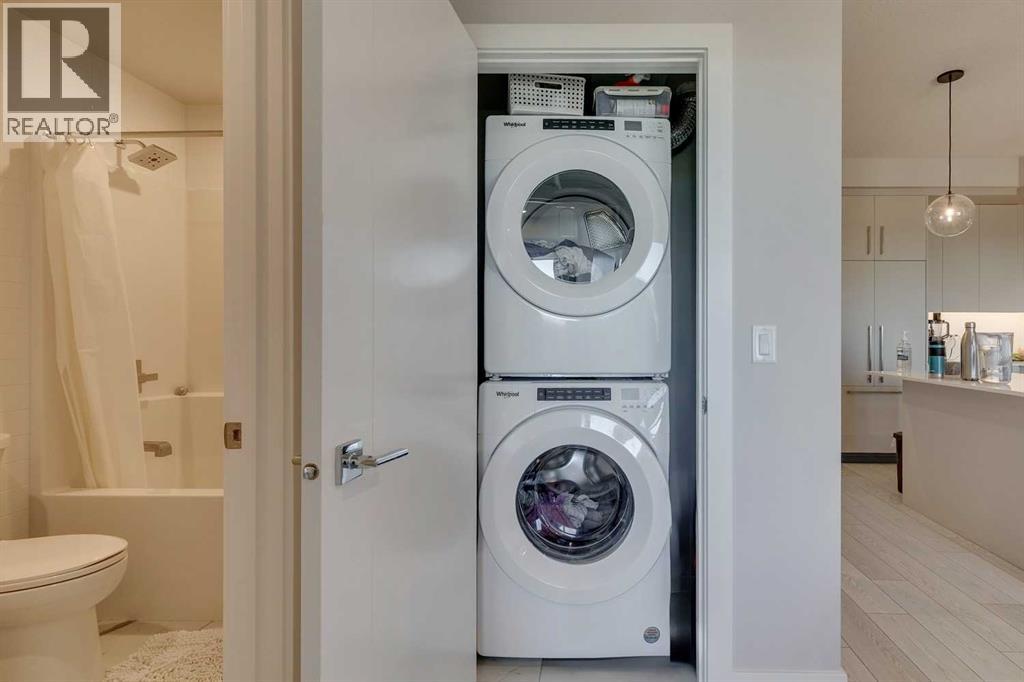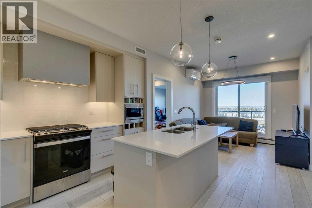 Welcome to elevated urban living at Mondrian, an architecturally striking residence nestled in the heart of Calgary’s highly coveted, master-planned West District. This top-floor 2-bedroom + den, 2-bathroom unit offers the perfect blend of sophisticated style and smart functionality—ideal for professionals, couples, or anyone who appreciates contemporary comfort in a prime location. Step inside to discover a bright, open-concept layout designed for both everyday living and stylish entertaining. The modern kitchen is a chef’s dream, featuring premium appliances including a gas cooktop, sleek cabinetry, and elegant finishes. The kitchen flows effortlessly into the spacious living and dining area, which extends out to your private balcony—perfect for morning coffee or unwinding with sunset views. Both bedrooms are generously sized, with the primary suite offering a peaceful retreat and its own spa-inspired ensuite. The versatile den provides the flexibility to create a home office, study space, or creative corner tailored to your needs. Additional highlights include in-suite laundry, central A/C, and an abundance of natural light throughout. This unit also includes a titled underground parking stall and a separate storage locker, ensuring convenience and peace of mind year-round. As a resident of Mondrian, you'll enjoy access to an exclusive rooftop terrace—a stunning communal space with panoramic city and mountain views, ideal for hosting or relaxing above it all. Location is everything, and Mondrian places you steps from boutique shopping, fine dining, and lush parks—all in one of Calgary’s most vibrant and walkable neighborhoods. Move-in ready and designed for modern life, this exceptional home is your opportunity to live in style at the center of it all. (id:51913)