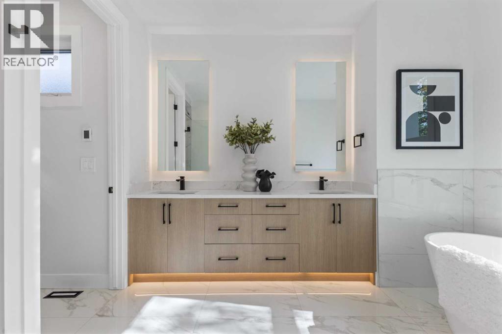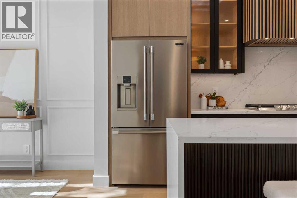 Sophisticated design and everyday function come together in this newly built semi-detached home, tucked onto a quiet, tree-lined street in the desirable community of Mount Pleasant. Spanning over 1,900 sq. ft. above grade, this home delivers 3 bedrooms, 2.5 bathrooms, and a thoughtfully designed legal 2-bedroom basement suite (approved by the city) – perfect for multigenerational living or added income potential. Just steps from Confederation Park and the amenities of the 4th Street corridor, this home offers the rare blend of luxury finishes, modern convenience, and unbeatable location.Step inside to 10’ ceilings, wide-plank engineered hardwood, and custom millwork that set an elevated tone from the start. At the front of the home, a bright dining space overlooks the tree canopy, while a discreet pocket office provides the perfect work-from-home setup with a built-in desk and storage.The heart of the main level is the chef’s kitchen, featuring a striking two-tone design with full-height cabinetry, quartz counters, a waterfall island with seating, and premium appliances including a panel-ready fridge, gas range, wall oven, and custom hood fan. A built-in pantry wall and oversized island ensure both form and function.Beyond, the living room invites gatherings with its gas fireplace surrounded by sleek tile and floating shelves. Large sliding doors flood the space with natural light and extend the living area into the landscaped backyard. At the rear, a mudroom with built-in lockers and a powder room keep daily comings and goings seamless.The second level is designed for family living. The primary retreat is a true sanctuary with soaring vaulted ceilings, oversized windows, and a large walk-in closet. The spa-inspired ensuite features heated tile floors, dual vanities, a freestanding soaker tub, glass-enclosed shower with dual showerheads, and private water closet.Two additional bedrooms with custom closets, a 4-piece bath, and a full laundry room with sink and cabinetry complete this level.The fully finished basement is a legal 2-bedroom suite with its own private side entrance. Finished to the same high standards as the upper floors, the suite includes a bright kitchen with quartz counters and stainless steel appliances, an open-concept living and dining space, a 4-piece bathroom, in-suite laundry, and two comfortable bedrooms with ample closet space. Perfect for extended family, guests, or rental income, it’s a flexible space that adds both livability and long-term value.Enjoy indoor-outdoor living with a private, north-facing backyard that’s ideal for summer entertaining. A double detached garage provides secure parking and storage.Mount Pleasant is one of Calgary’s most connected neighbourhoods, offering quick access to downtown, 16th Avenue, and major commuter routes. You’re walking distance to Confederation Park, playgrounds, and top-rated schools, with local favourites like Velvet Café, 4th Spot Kitchen & Bar, and Milk Ice Cream nearby. (id:51913)