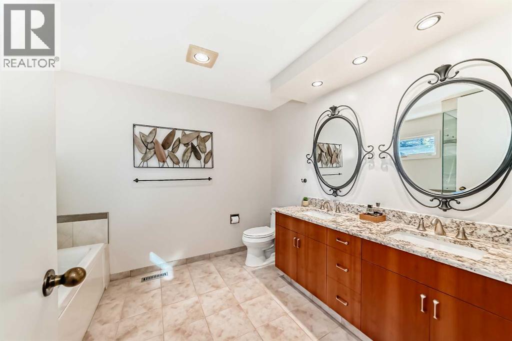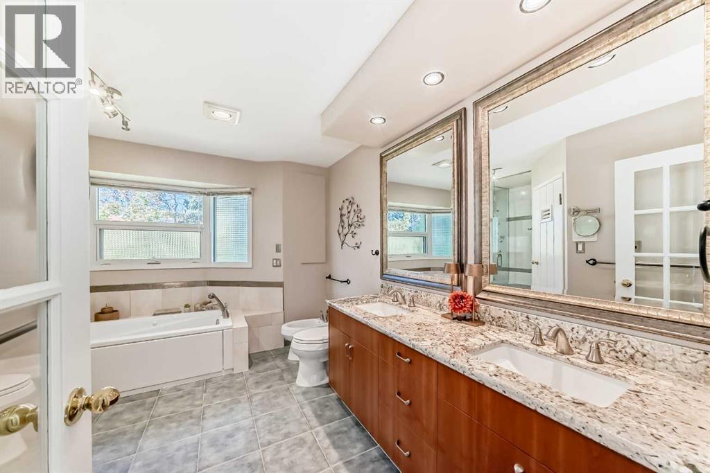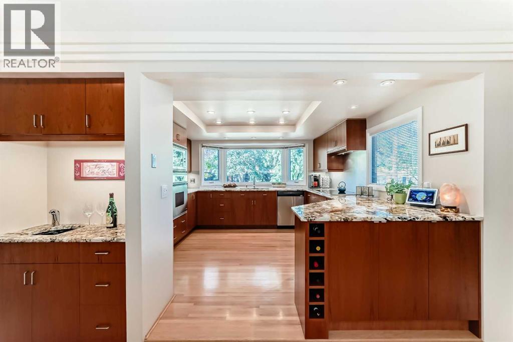Welcome to this exceptional & spacious 3 bed/3.5 bath fully renovated semi detached home, with 4 separate outdoor spaces, situated in a gated 18+ complex, a stroll across the street from South Glenmore Park, the Weaselhead natural area & off leash park, in the highly sought after community of Oakridge!! This is one of the largest units in this small complex with over 3000 sq ft of living space, perfect for any walk of life. You'll be welcomed outside by the completely redone front courtyard, a relaxing space to enjoy a glass of wine at the end of the day. Upon entering the home, you'll appreciate the gorgeous matte hardwood flooring w/custom inlaid trim, elegant crown mouldings & large Lux triple paned windows throughout the home, filling the space with an abundance of light. Overlooking the courtyard is your intimate sunken conversation area with a stunning crystal light feature & gas fireplace for ambience. The spacious formal living & elegant dining areas flow seamlessly, perfect for entertaining. Through the sliders off the living/dining area is a outdoor dining space for al fresco meals on warm summer evenings. The renovated kitchen features granite counters, large window overlooking the peaceful park-like backyard, custom built cherrywood cabinetry, Wolf electric cooktop, Dacor wall oven, Panasonic wall microwave, LG fridge, built in wine cubby & bar area. The generous family/kitchen dine-in area features a new gas Valor Legend fireplace insert (2024) & sliding doors out to the large deck running the width of the home. The powder room with Italian marble vanity counter and main floor laundry complete the level. Upstairs you'll appreciate the hardwood continuing throughout. The serene primary suite features a generous sleeping area, a separate conversation/TV area with gas fireplace, large windows, a private upper balcony, & walk in closet. The sumptuous spa like 6pc ensuite features a large double vanity with Italian marble counter, glass walk shower with It alian marble, jetted tub, bidet & built in sauna for those chilly winter mornings. The upper office features French doors, built in bookshelves & a balcony. The bonus room features large windows & small wet bar area, perfect for movie nights. Two large additional bedrooms and huge upper 5 pc bath (with Italian marble!) complete the upper level. The fully developed lower level features a large recreation room with pool table, a flex/gym space with built in desk & bookcase and 3 pc bath. Additionally is a large storage/wine room (plus more under the stairs). The double oversized heated & insulated garage features an eco friendly garage floor wash bay drain, plus side door and plenty of storage. Ideally located across from South Glenmore Park & the Weaselhead natural area, walking distance to Oakbay Plaza, a quick drive to Glenmore Landing & Oakridge Co Op, and a short commute to downtown via Stoney Trail, this home features the best of both worlds, balancing nature & city life! Book your showing today! (id:51913)
