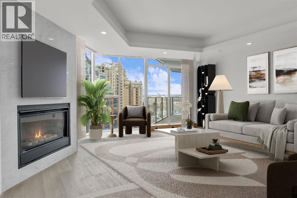** NEW PRICE, NEW OPPORTUNITY** PRIVATE ELEVATOR | HIGH FLOOR | CITY SKYLINE & RIVER VIEWS | 2 BEDROOMS + DEN | TWO TITLE PARKING STALLS! WELCOME TO THE CONCORD - Calgary's most prestigious riverfront residence, an architectural icon that defines luxury living! Experience this unparalleled luxury large unit living at The Concord, where a private elevator transports you directly into your exquisite residence. This stunning home is designed with the finest finishes and features, including a German-engineered Poggenpohl kitchen, Miele appliances. The thoughtfully crafted interior boasts engineered hardwood flooring, Bianco Carrara marble accents, rich walnut detailing, a full-height Bianco Statuario marble encased fireplace, and floor-to-ceiling windows showcasing breathtaking Bow River views. Enjoy year-round comfort with heated tile flooring, a horizontal four-pipe fan coil system for heating and cooling, and a BRIGHT GLASS DOOR OPEN DEN perfect for a home office. The spacious primary suite is a private retreat with a custom walk-in closet, and a 5-piece spa-inspired ensuite, complete with dual sinks, a deep soaker air-jet tub, a separate shower and heated marble floors. A patio door leads to a private balcony, offering a serene escape with stunning city and Bow River views. The second bedroom also enjoys balcony access and its own floor-to-ceiling marble bathroom with heated floors. Additional features include an in-suite full-size washer and dryer, two titled side by side parking stalls, and a titled storage room. World-Class Building Amenities include: 24-hour Concierge & Security services | 6 high-speed Elevators | Elegant Social Lounge with a Bar, full kitchen for your private events | State-of-art Fitness Centre | Touch-less automatic car wash | Ample guest parking | Stunning outdoor water garden and pond (transforms into a winter Skating rink) | Outdoor kitchen with BBQ and 2 fire-pits, perfect for entertaining. Exciting future amenities (Phase II - Launching in May, 2025) include: Resort-style swimming pool and a hi-tech golf simulator. With unparalleled elegance, world-class amenities, and the best value in The Concord. This offering is truly one-of-a-kind and best value in Calgary RIVER FRONT luxurious living. CALL TODAY TO SCHEDULE YOUR PRIVATE VIEWING! (id:51913)